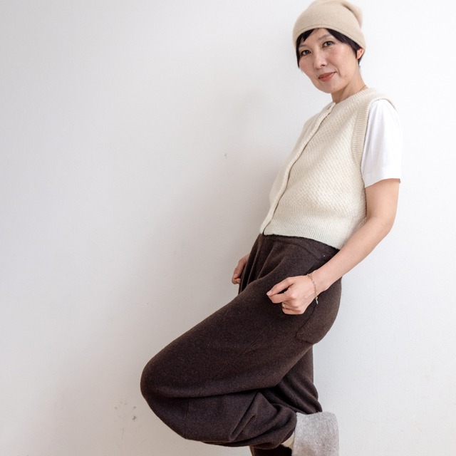 □在庫限りで終了です。 -------------------- 【上質ベーシックな安心感/ヤクのピュアベスト】 モンゴル産ヤク毛100%のシンプルベストは、深みのあるヤク毛そのままのおだやかな無染色。こっくりとしたこげ茶色です。 丸首クルーネックのすっきりとした定番デザイン。ヤク毛ならではの弾力感とふんわりなめらかな風合いで、ひと目で上質さが伝わります。 薄手で軽く、格別のあたたかさ。調湿性に優れているため、秋・冬・春先はもちろん、梅雨寒や冷房対策にも便利です。インナーにも重ね着にも幅広く使える、ユニセックス仕様のフリーサイズです。 -------------------- ■組成 ヤク100% ■サイズ フリー(11枚目の画像をご覧ください) ■重さ 約170g ■時期 インナーベストとして通年。シャツや薄手ニットとレイヤーさせて真夏以外ご着用いただけます。 ■ヤク×カシミヤ比較 あたたかさは同程度ですが、肌あたりがいくらか異なります。ヤクはほどよい弾力と安定感があり、安心して身をゆだねられる着け心地が魅力。カシミヤはどこまでもやさしいやわらかさで、着けているのを忘れる一体感が魅力です。 ■お手入れ 中性洗剤・ネット入れ・水、で洗濯機洗い可能です。 ■毛玉 無理に引っぱらず、ハサミで丁寧にカットしてください。 -------------------- □ご確認いただきたいこと 「空飛ぶ羊」のアイテムは、モンゴルの大自然に生きる動物たちの天然毛を使用しています。採毛時期や仕上げ加工により、色味・風合い・サイズ感に個体差が生じることがあります。これは天然素材ならではの特性です。 天然毛は使うほどにやわらかく肌になじみます。経年の変化を楽しみながら、長く大切にお使いいただけますように。