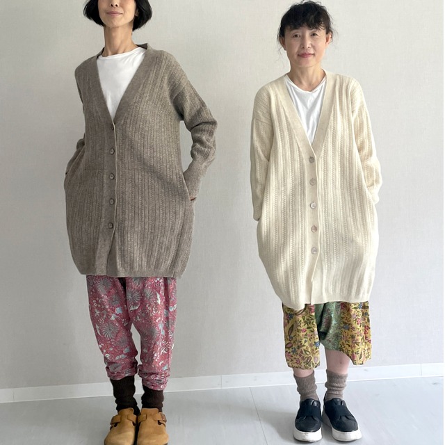 ---------------------------------- □在庫限りで終了です。 ---------------------------------- 【安心のロング丈&着やすさいちばん/ウールのコーディガン】 モンゴル産ウール100%、長め丈のコーディガンが届きました。ぽこぽこした縄編みで、コート未満・カーディガン以上。安心感あふれる一着です。 天然繊維が空気をたっぷり含んであたたかく、肌なじみの良いやさしい着心地が魅力。縄編みのタテライン効果で見た目すっきり。おしりをすっぽりと包む安心丈と、長めリブの袖口デザインで、カジュアルにもエレガントにも着こなし自由。脇のポケットも使い勝手抜群です。 小寒くなりはじめた秋のはじめから本格的な真冬まで、デイリーで重宝するハオリモノの一等賞。寒暖差対策に活躍できる便利な一枚で、秋冬の毎日が快適になります。 羊毛そのままの無染色、ナチュラルな「グレー」と「オフホワイト」の2色展開です。 ---------------------------------- ■組成 ウール100% ■サイズ フリー ■お手入れ 中性洗剤+ネット使用+常温の水で洗濯機洗い可能です。 ■毛玉 無理に引っぱらず、ハサミで丁寧にカットしてください。 ---------------------------------- □ご確認いただきたいこと 「空飛ぶ羊」のアイテムは、すべてモンゴルの大自然に生きる動物たちの天然毛を使用しています。採毛時期により色味や風合いがシーズンごとにわずかに異なることや、仕上げ加工によるサイズ感に個体差が生じる場合があります。素材の特性としてご理解ください。 天然毛は使うほどにやわらかくやさしく肌になじみます。大切に育てるように、変化を楽しみながらお付き合いいただければ幸いです。