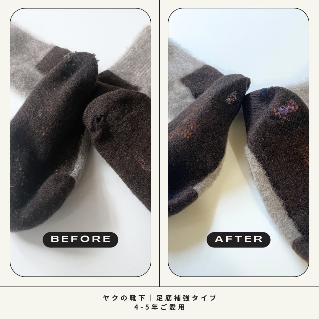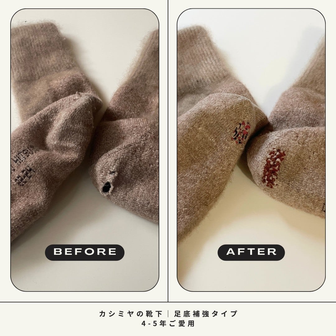 もともと足底は厚めにしっかりと仕上げている靴下ですが、長くご愛用いただくうちに「穴があく」「薄くなる」といった状態がどうしても気になってきます。天然毛の使い込みによる経年変化の悩ましいところです。