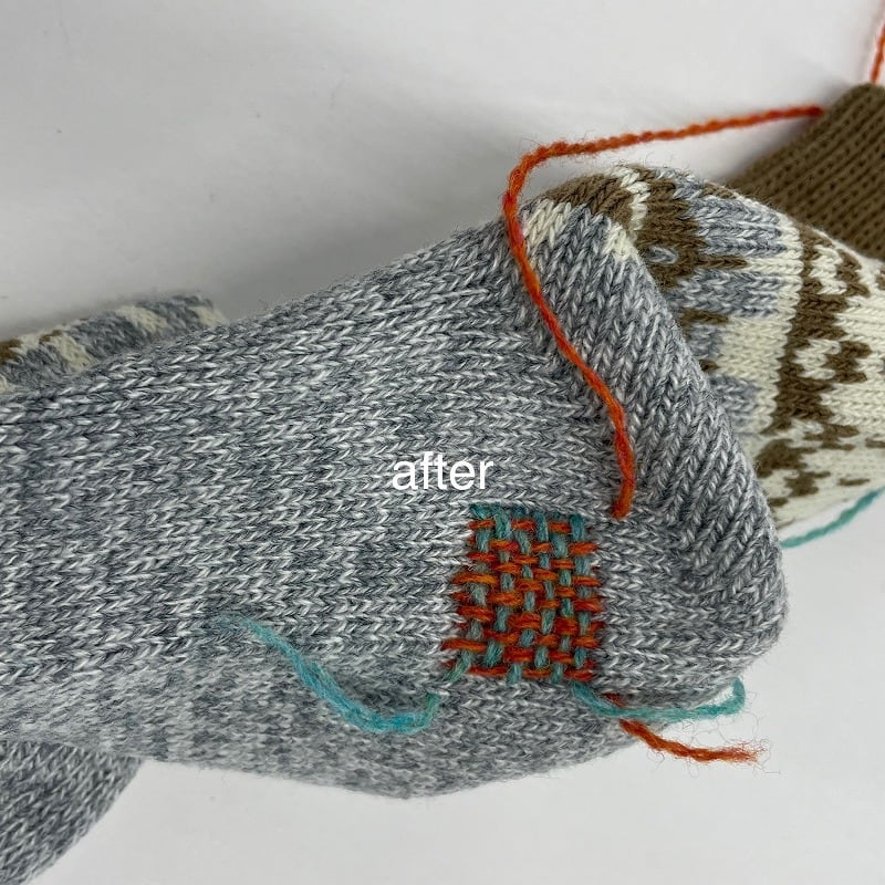 穴の空いた、空きそうな、または空く前にちょっと補修しておきたい厚手の靴下