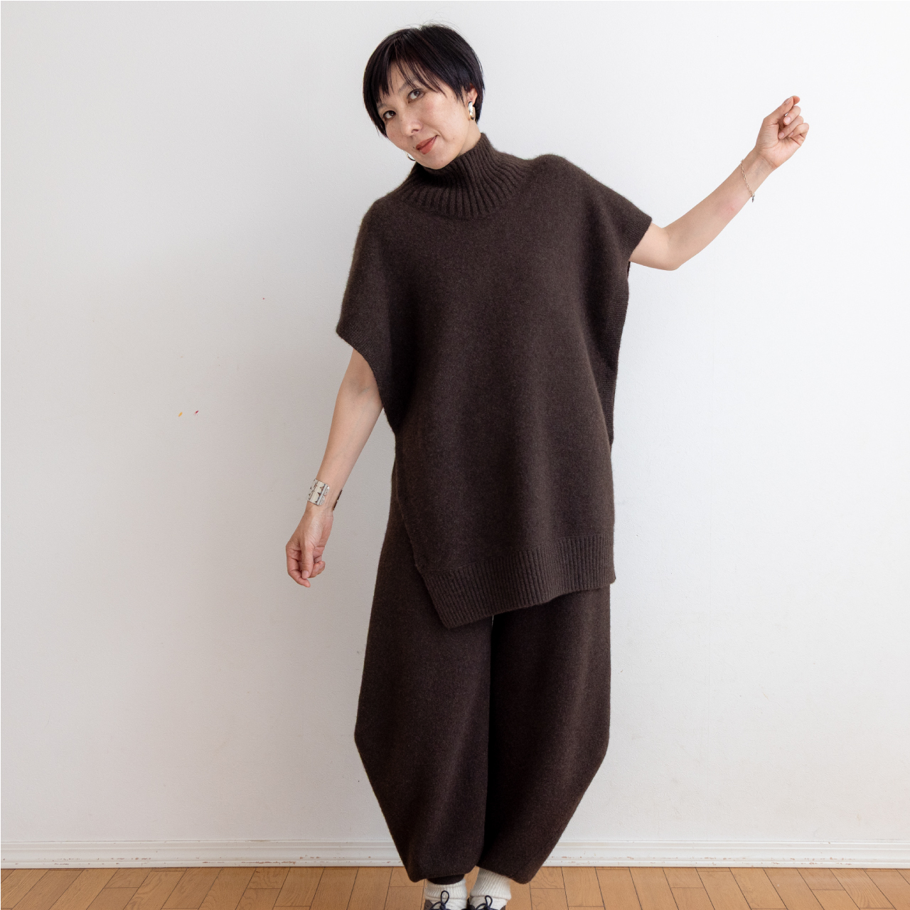 首まわりの太リブと自然に落ちるドレープが印象的。やわらかなミドルハイゲージで、肌ざわりなめらか、あたたかさも抜群です。パンツにもスカートにも合わせやすく、カジュアルにもエレガントにも馴染みます。