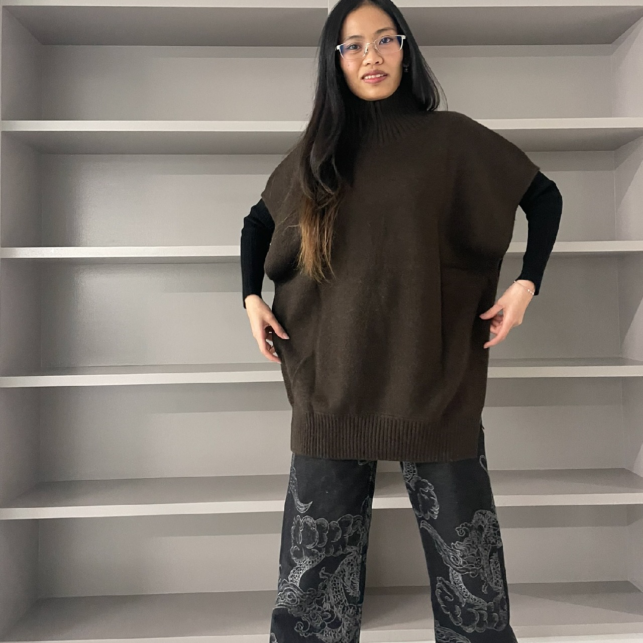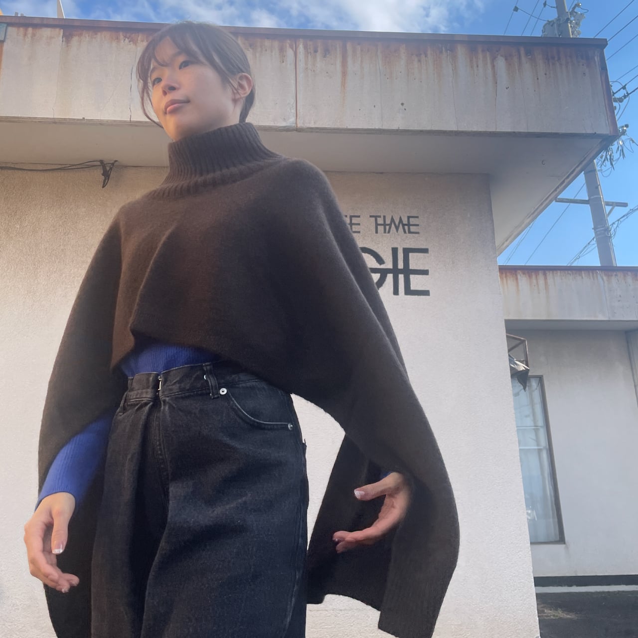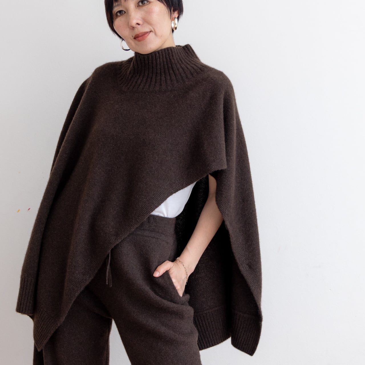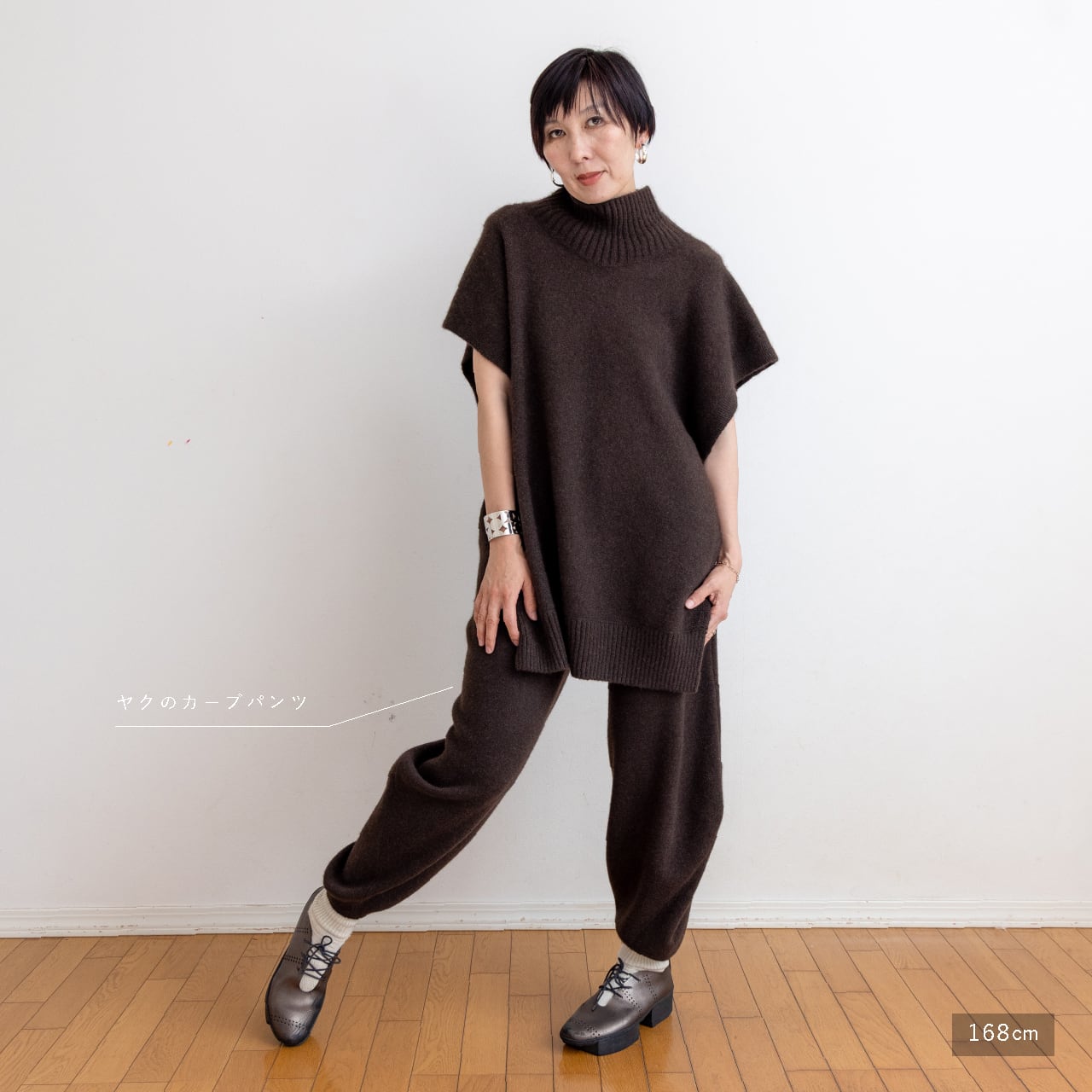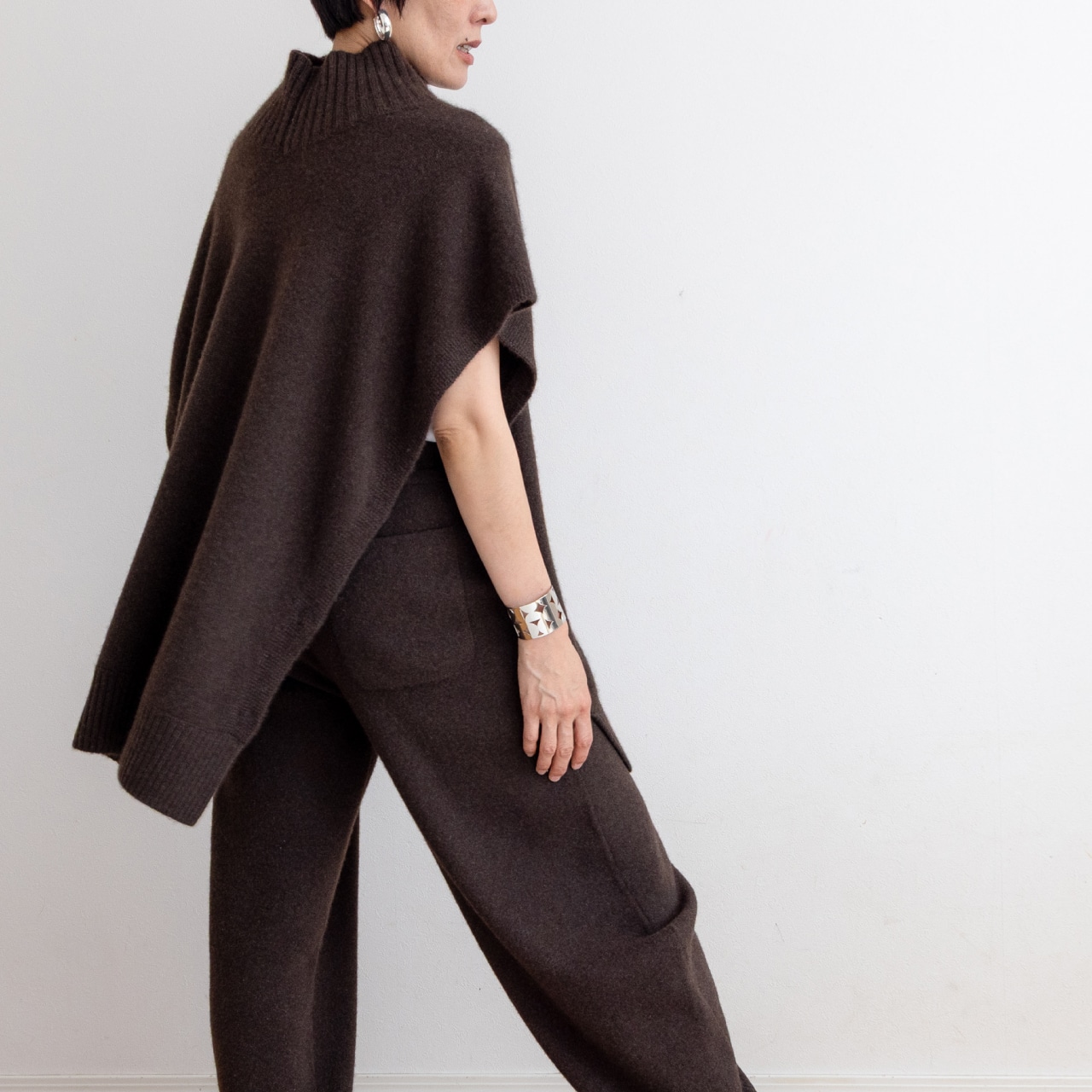 首まわりの太リブと自然に落ちるドレープが印象的。やわらかなミドルハイゲージで、肌ざわりなめらか、あたたかさも抜群です。パンツにもスカートにも合わせやすく、カジュアルにもエレガントにも馴染みます。そしてきっと誰かに褒められる