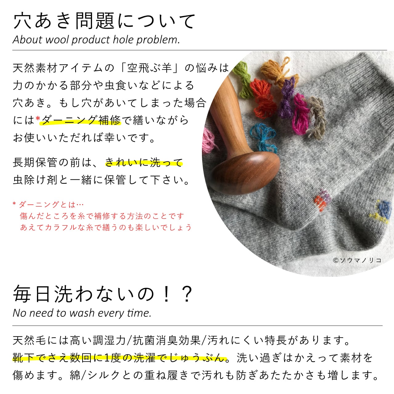 着用や洗濯を重ねると摩擦などで薄くなることがありますが、その際はダーニングなどで繕いながら、末永くご愛用ください。