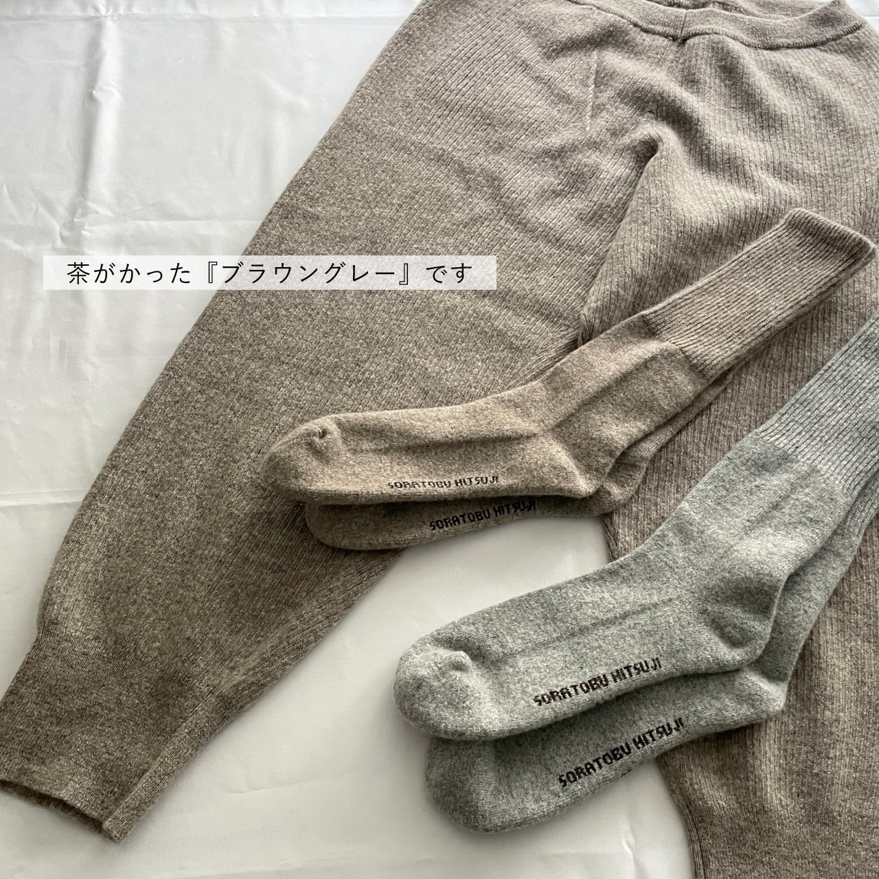 羊毛そのままの自然な無染色。どんなトップスにも合わせやすいやわらかな茶系グレーです。ユニセックスでおすすめします。