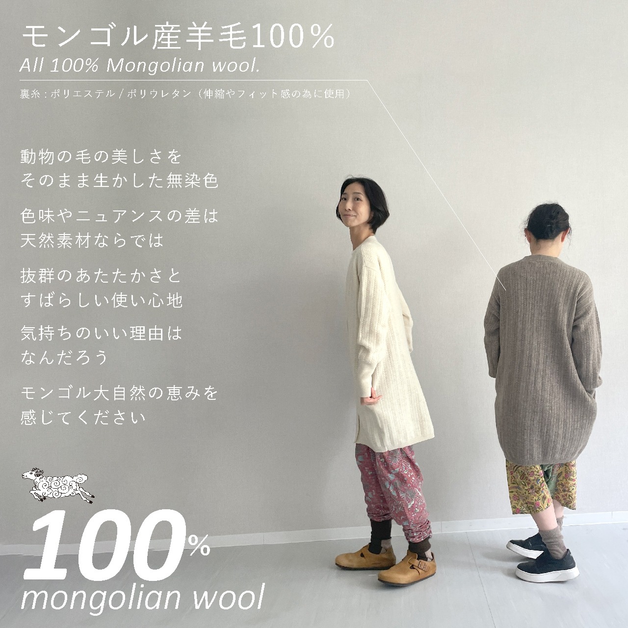 「空飛ぶ羊」のアイテムは、モンゴルの大自然に生きる動物たちの天然毛を使用しています。採毛時期や仕上げ加工により、色味・風合い・サイズ感に個体差が生じることがあります。これは天然素材ならではの特性です。