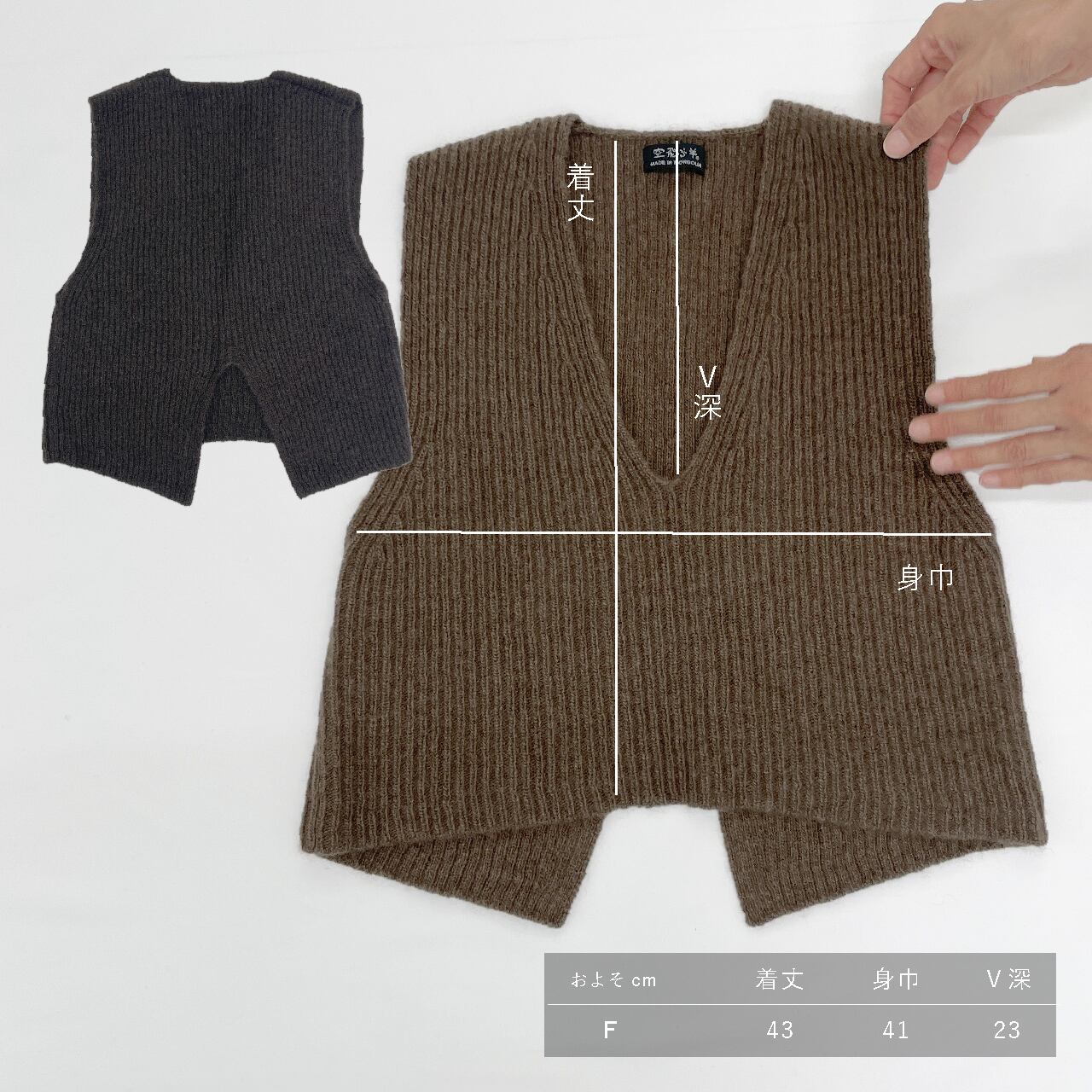 モンゴル産天然ヤク毛100%のコンパクトなベストは、深めのVネックと燕尾スリットが印象的です。