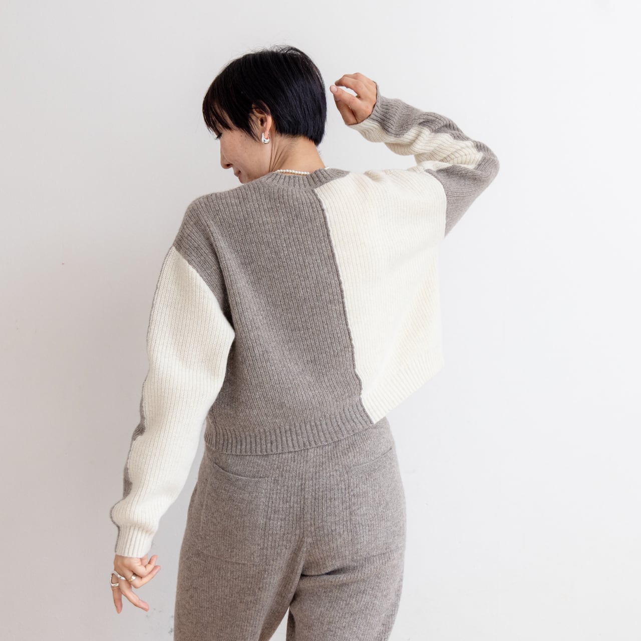 モンゴル産無染色ウール100%、グレーとオフホワイトの大胆な配色が映える新作丸首ニットができました。