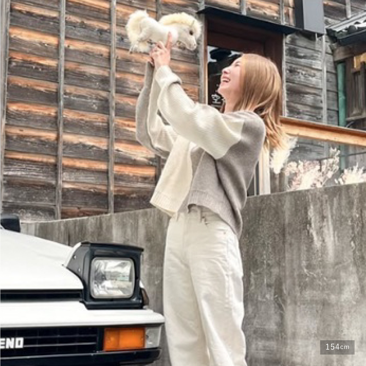 長め袖にやや短丈の絶妙バランスで、パンツ/スカートとどちらも合わせやすいのがポイント。ざっくりしたミドルゲージ編みでカジュアルながら上質なたたずまいです。