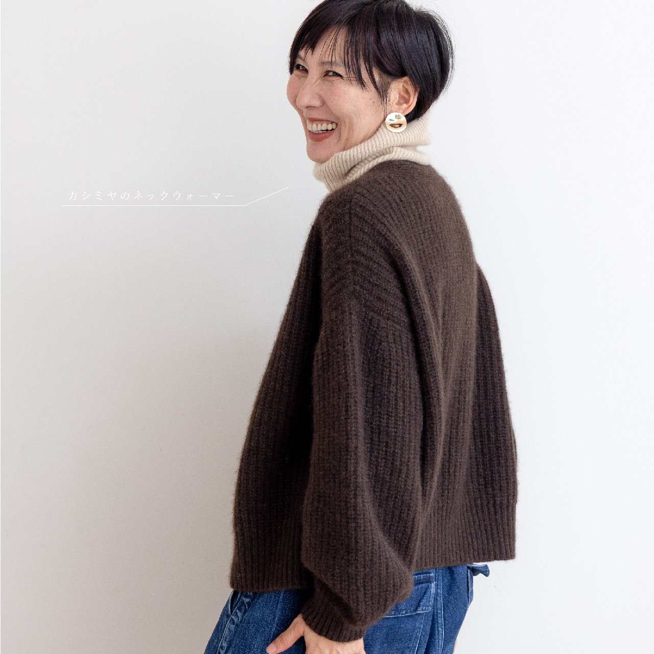 ふわふわでやわらかなドレープは、遠目でも質の良さがわかります。太リブと長めの袖が、大人の印象を引き立てます。