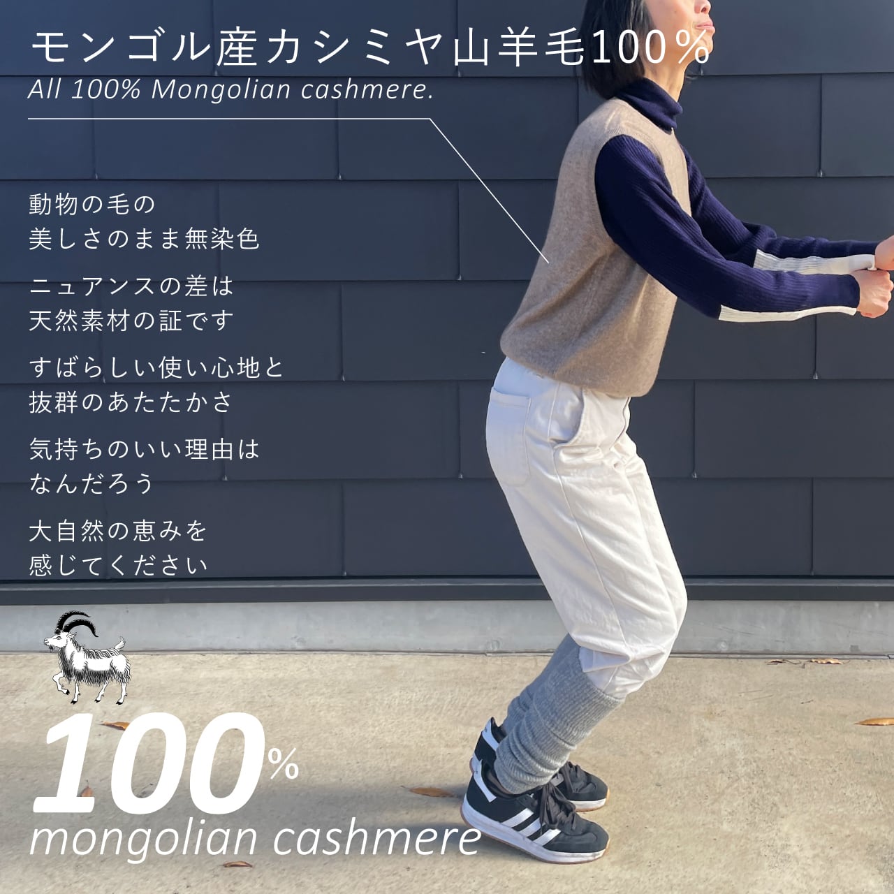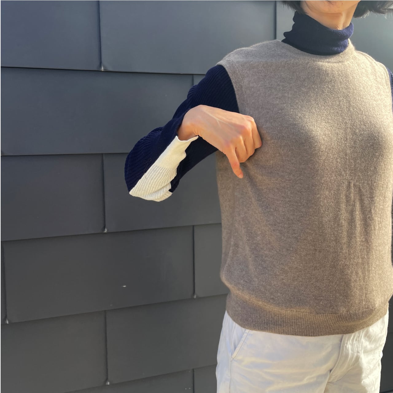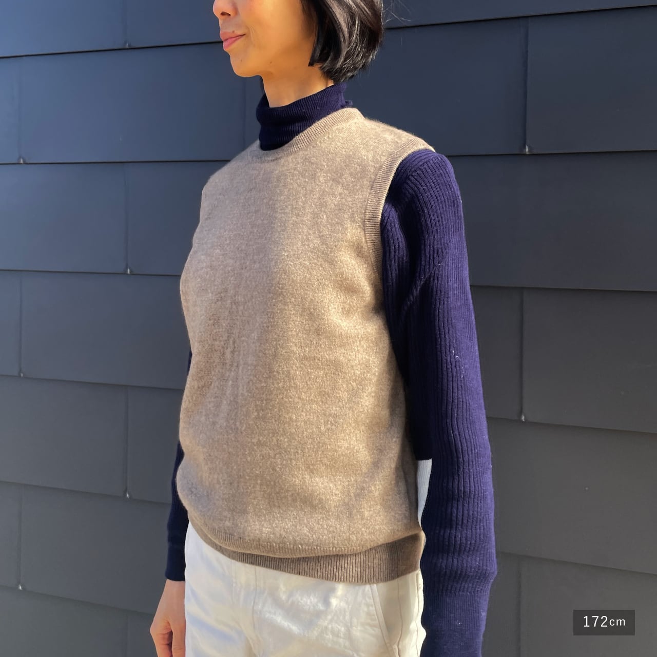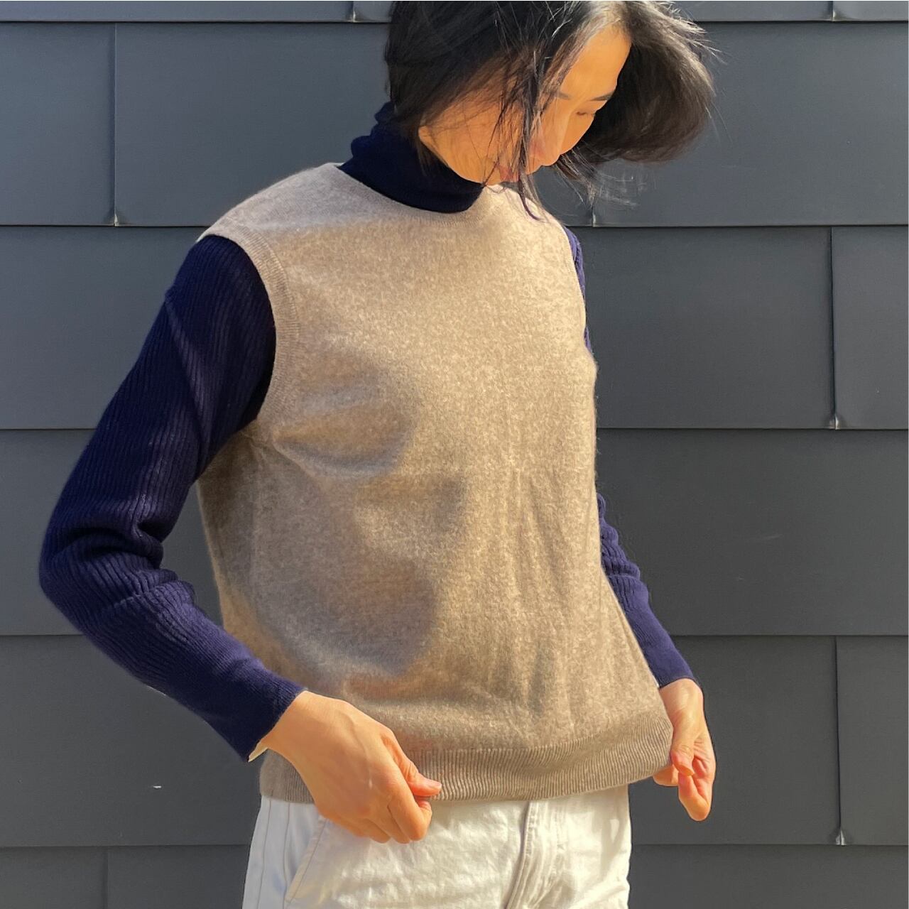 モンゴル産カシミヤ山羊毛100%のシンプルベストは、毛の色そのままの淡くやさしいミルクティ色。すっとやさしく寄り添うカラーです。