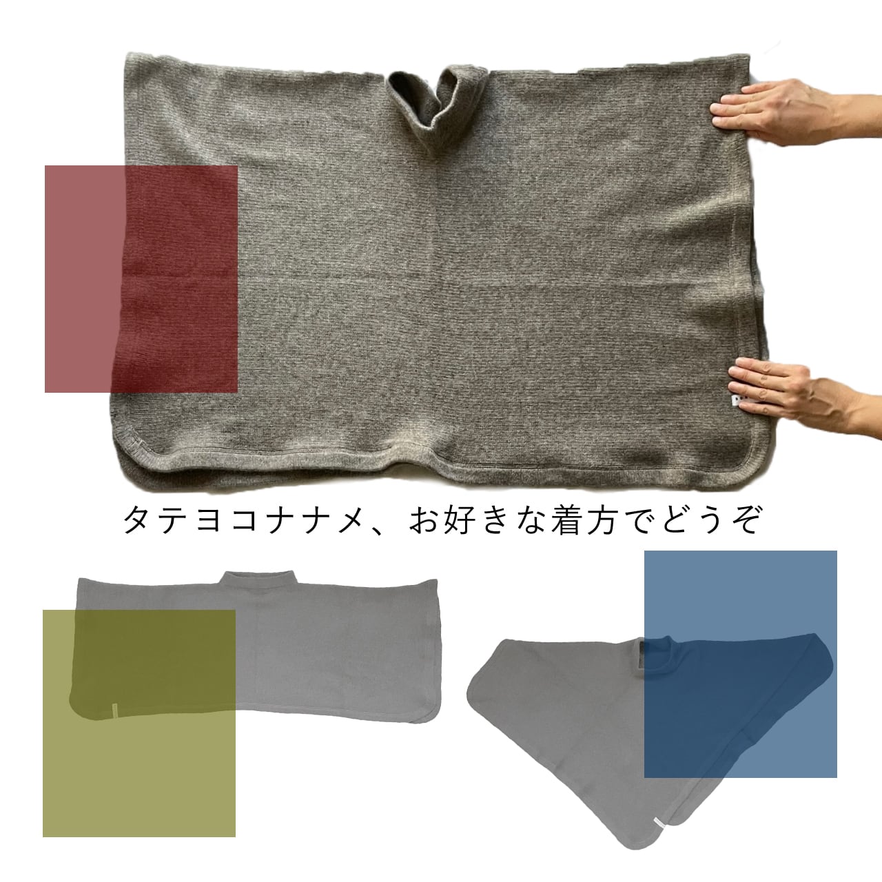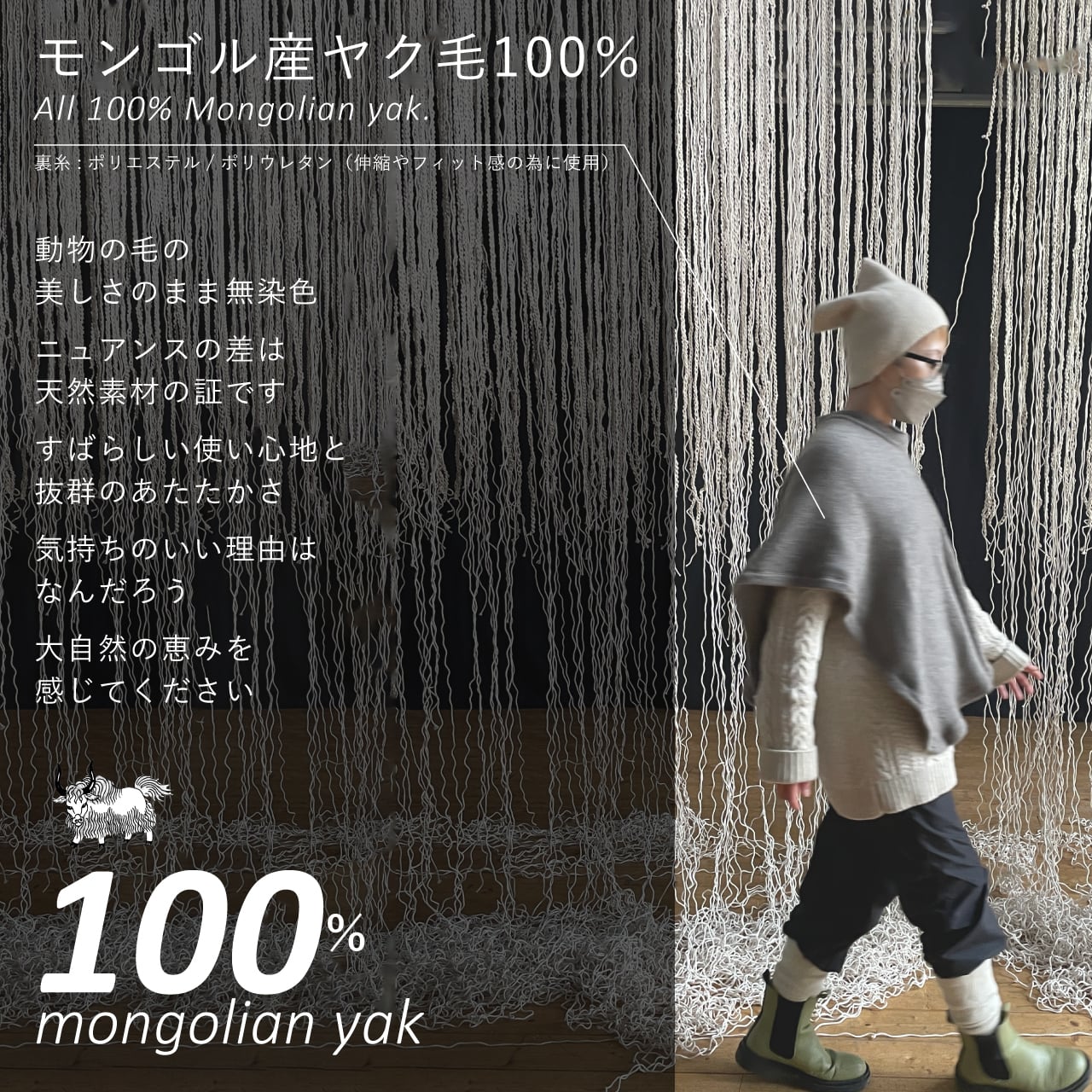 長方形に丸穴というシンプルなデザインで、少し持ち重みのある、見ればわかる上質ヤク毛をたっぷり使った贅沢なポンチョ。足・ヒザ・腕とマルチに使えるレッグウォーマー/ショートとセットしました。