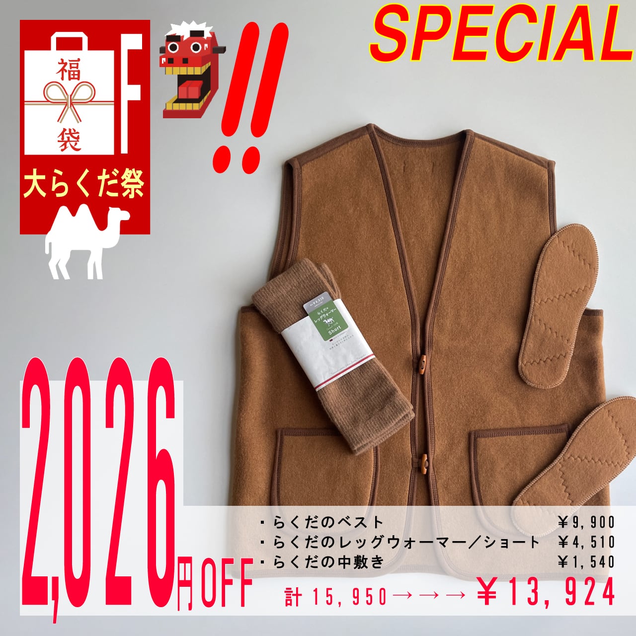 らくだ、らくだ、らくだ。今回の「webshop早めの福袋」SPECIALカテゴリ、らくだLOVEあふれる限定セットです。秋冬に頼れる「らくだのベスト」とその仲間たちを集めました。