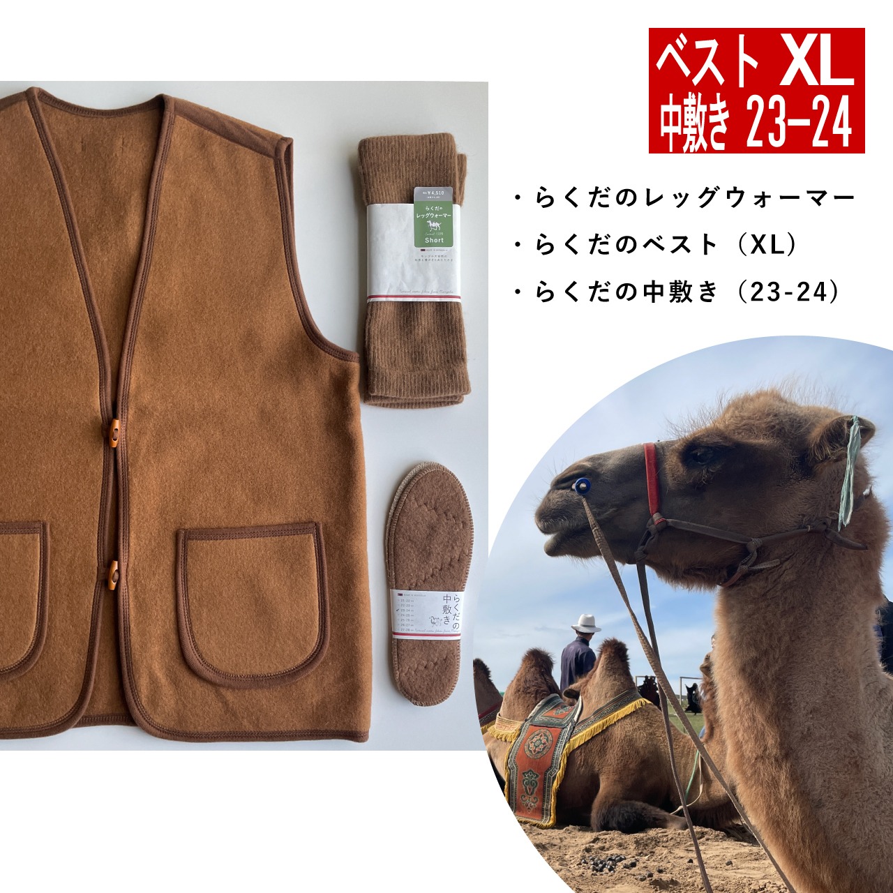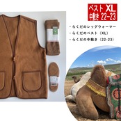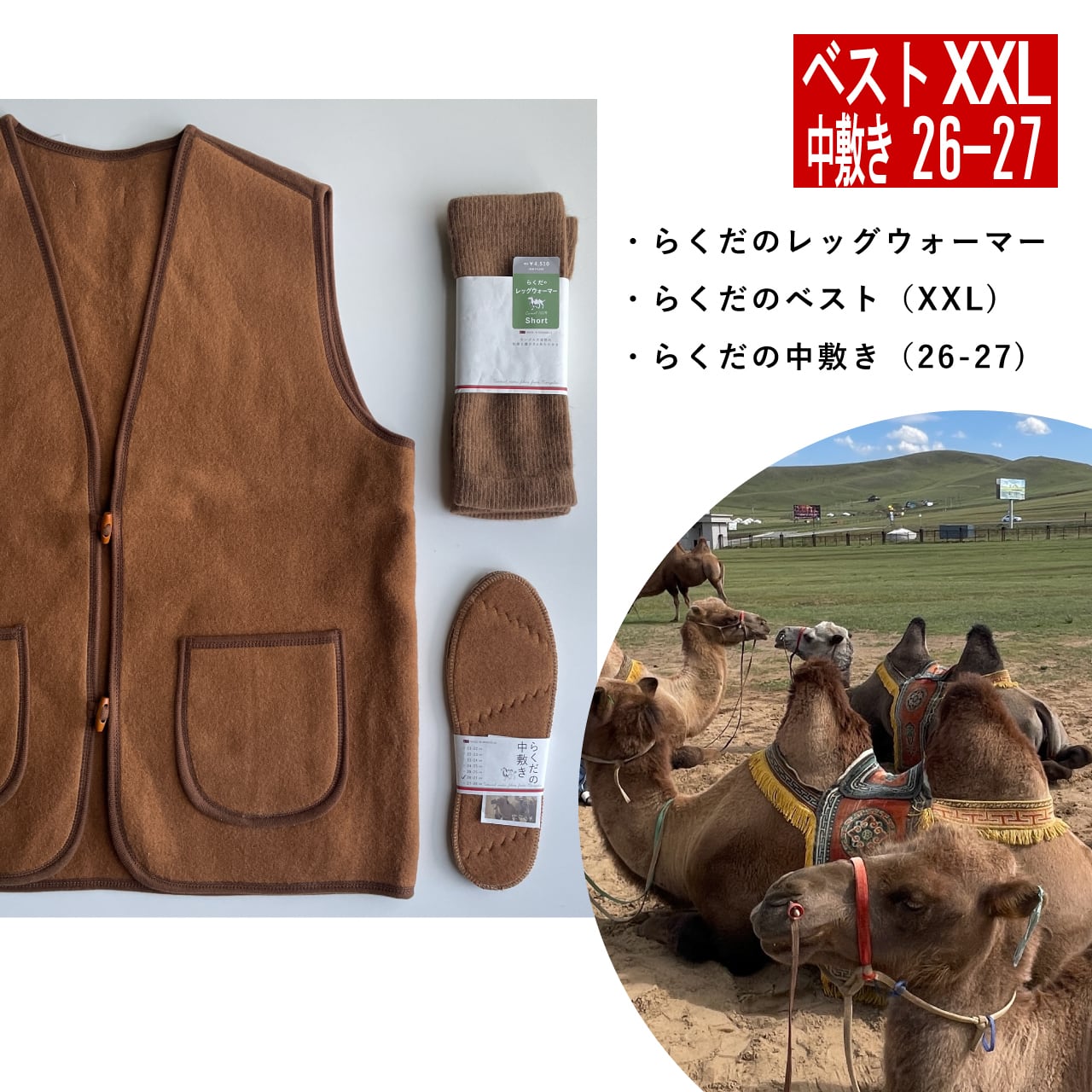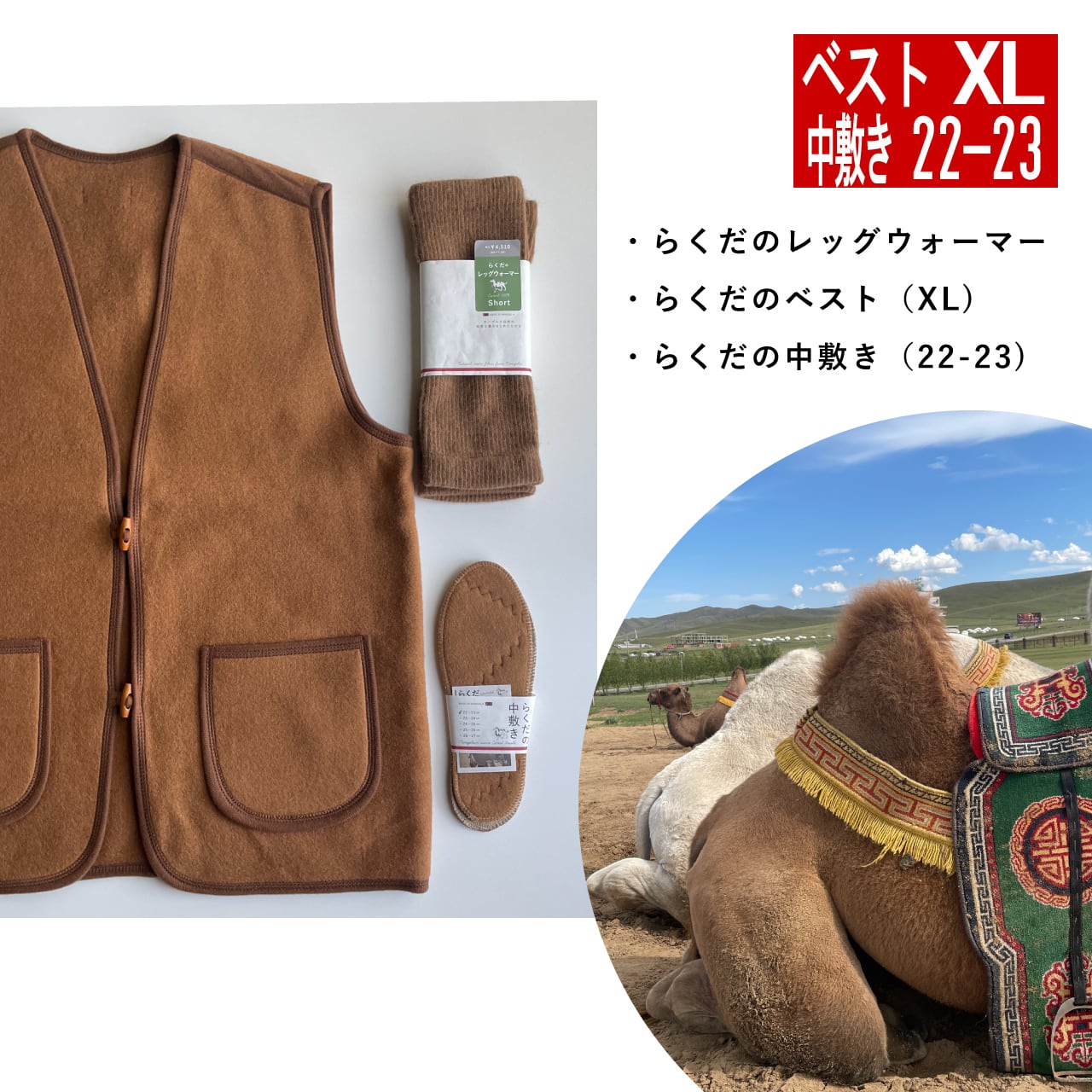 どれもモンゴル産天然毛100%。らくだそのままの黄土色は、どこか懐かしさのあるらくだ素材独特の表情です。足・ヒザ・腕とマルチに使えるレッグウォーマー/ショートに、ベストのハギレから生まれた中敷きを合わせた、夢のらくだ3点セットです。