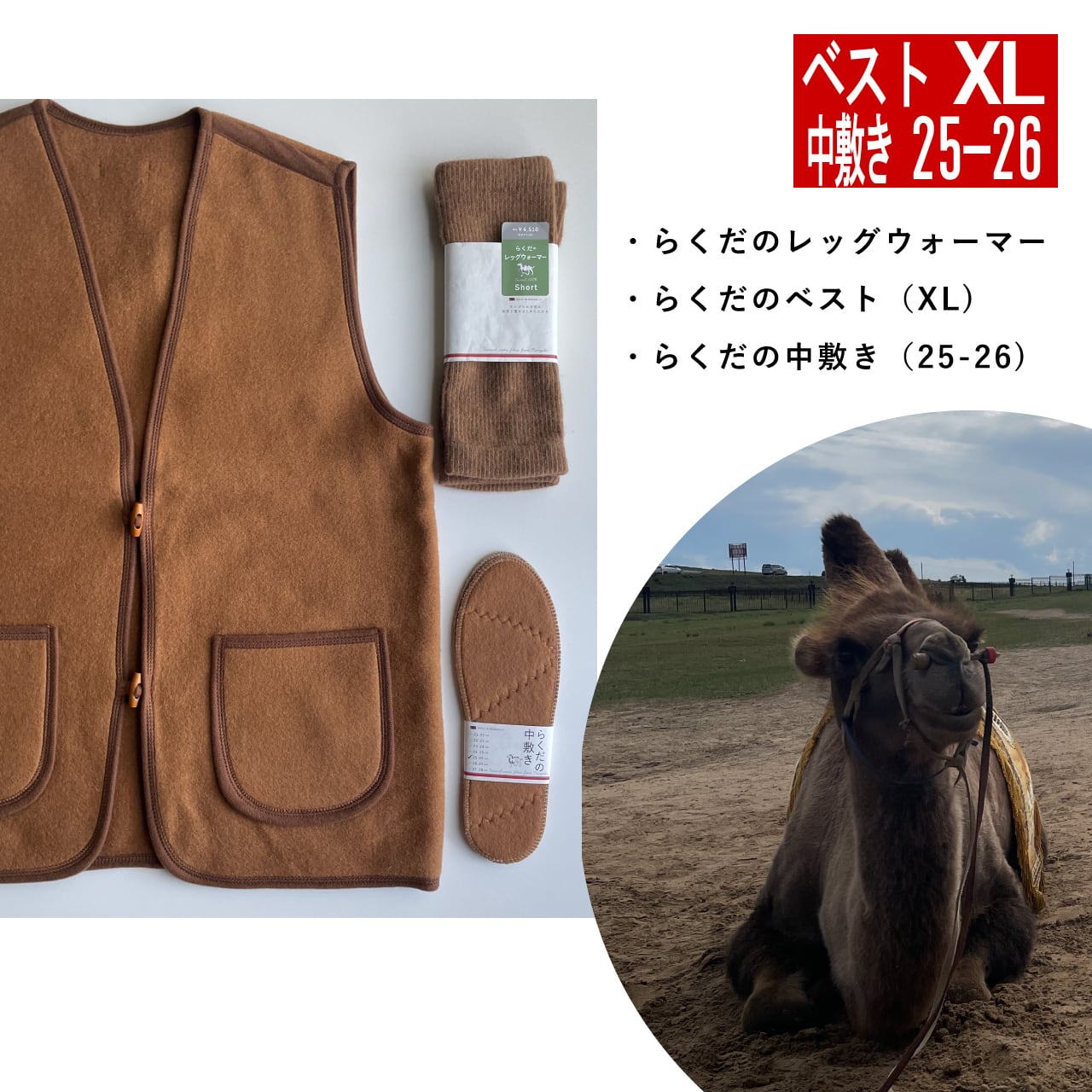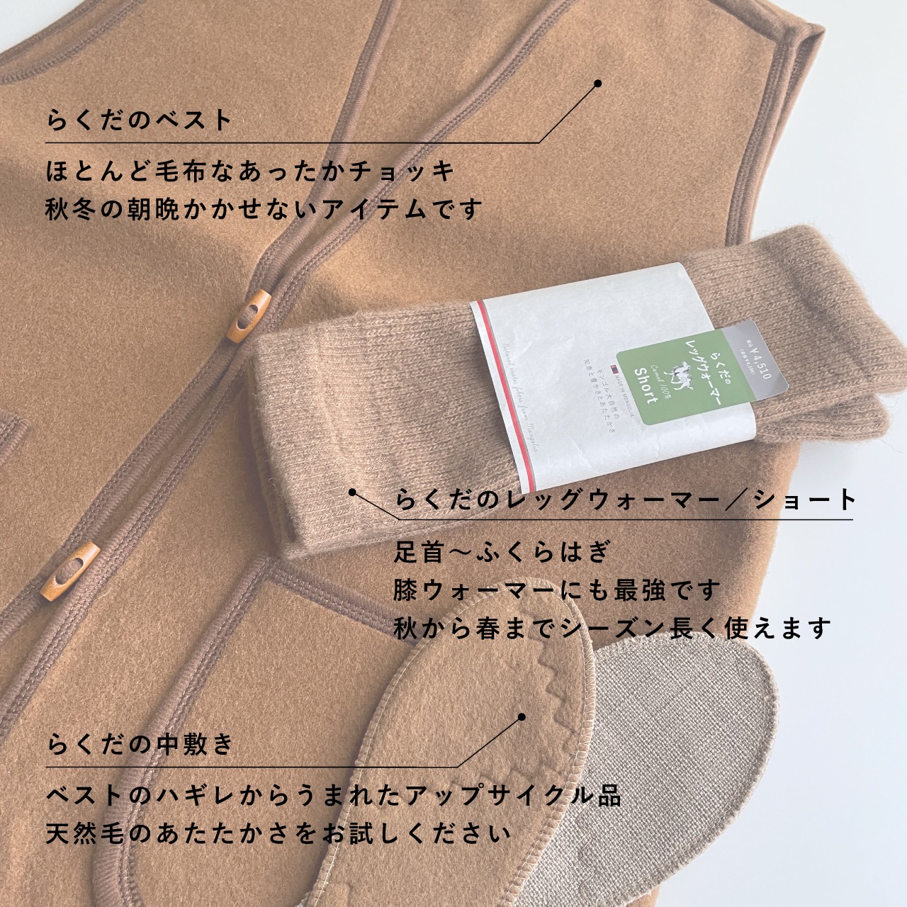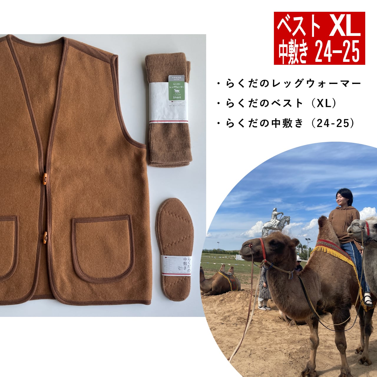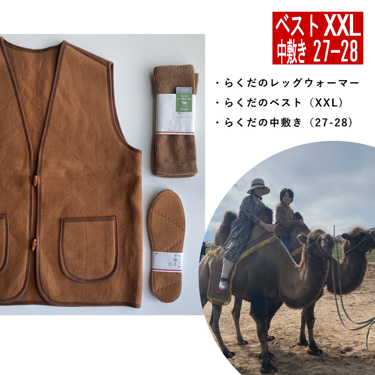 どれもモンゴル産天然毛100%。らくだそのままの黄土色は、どこか懐かしさのあるらくだ素材独特の表情です。足・ヒザ・腕とマルチに使えるレッグウォーマー/ショートに、ベストのハギレから生まれた中敷きを合わせた、夢のらくだ3点セットです。