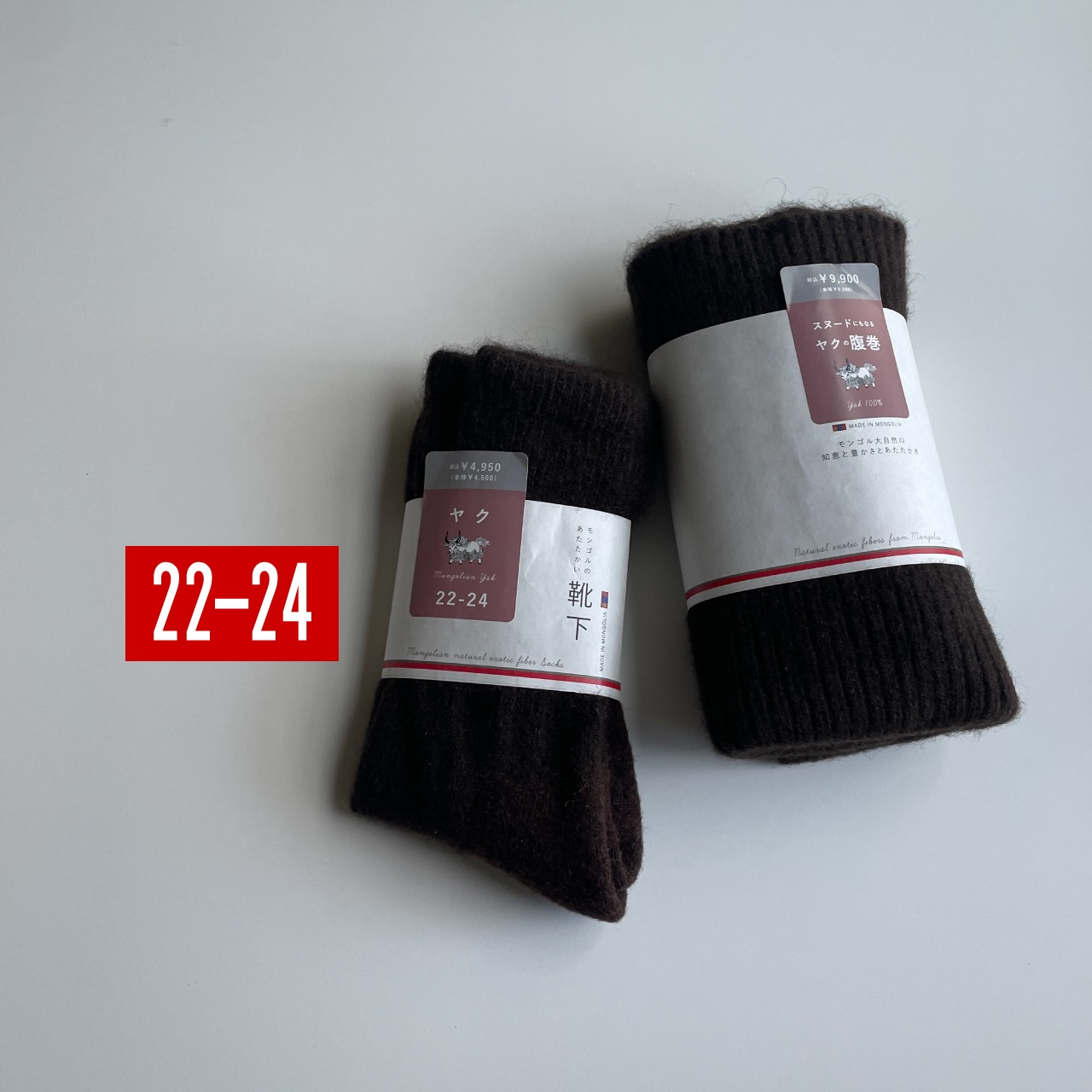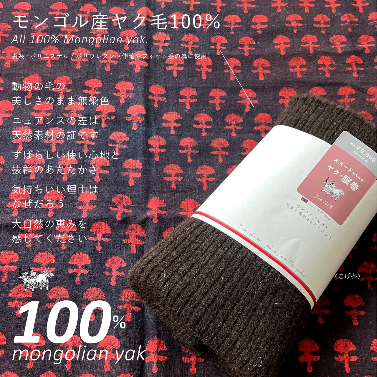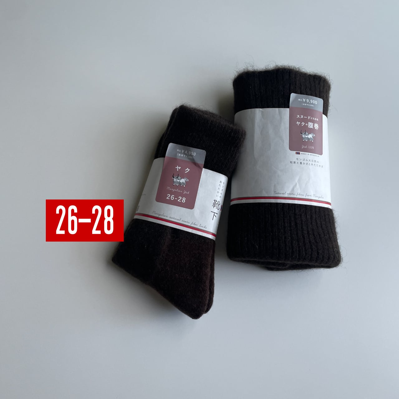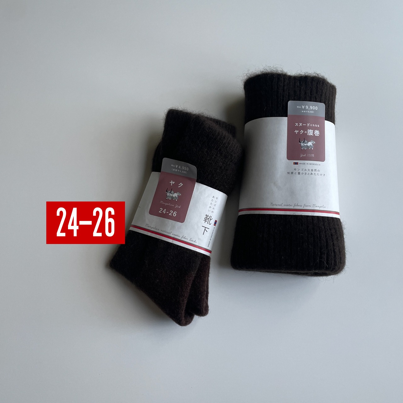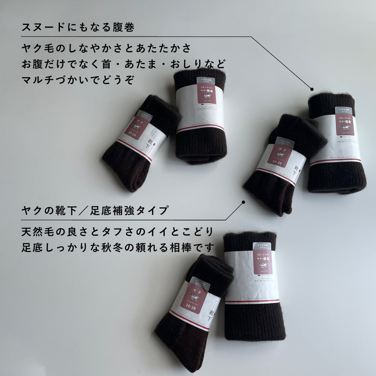しっかりと厚みのある、なめらかなヤク毛100%。お腹はもちろん、おしり・頭・首元(スヌード)にも使えるあたたかな「ヤクの腹巻」と、足底補強タイプのヤク靴下を組み合わせました。