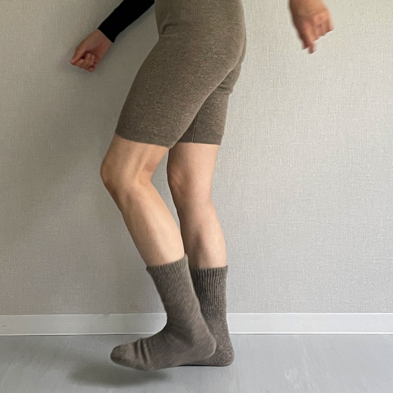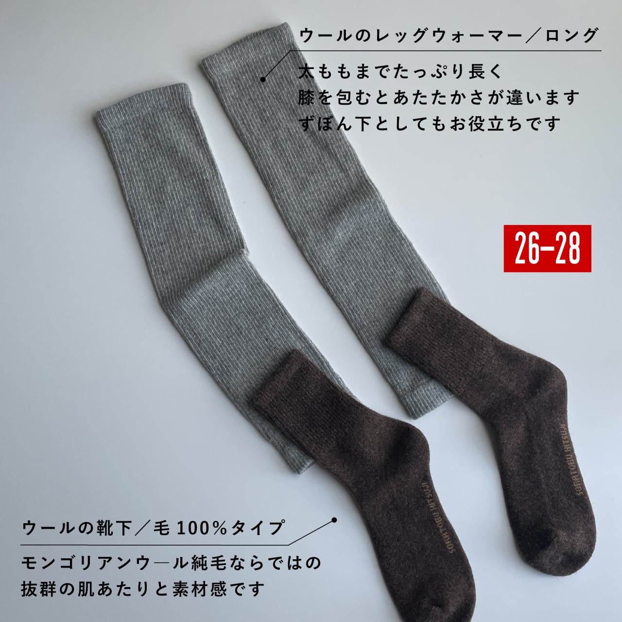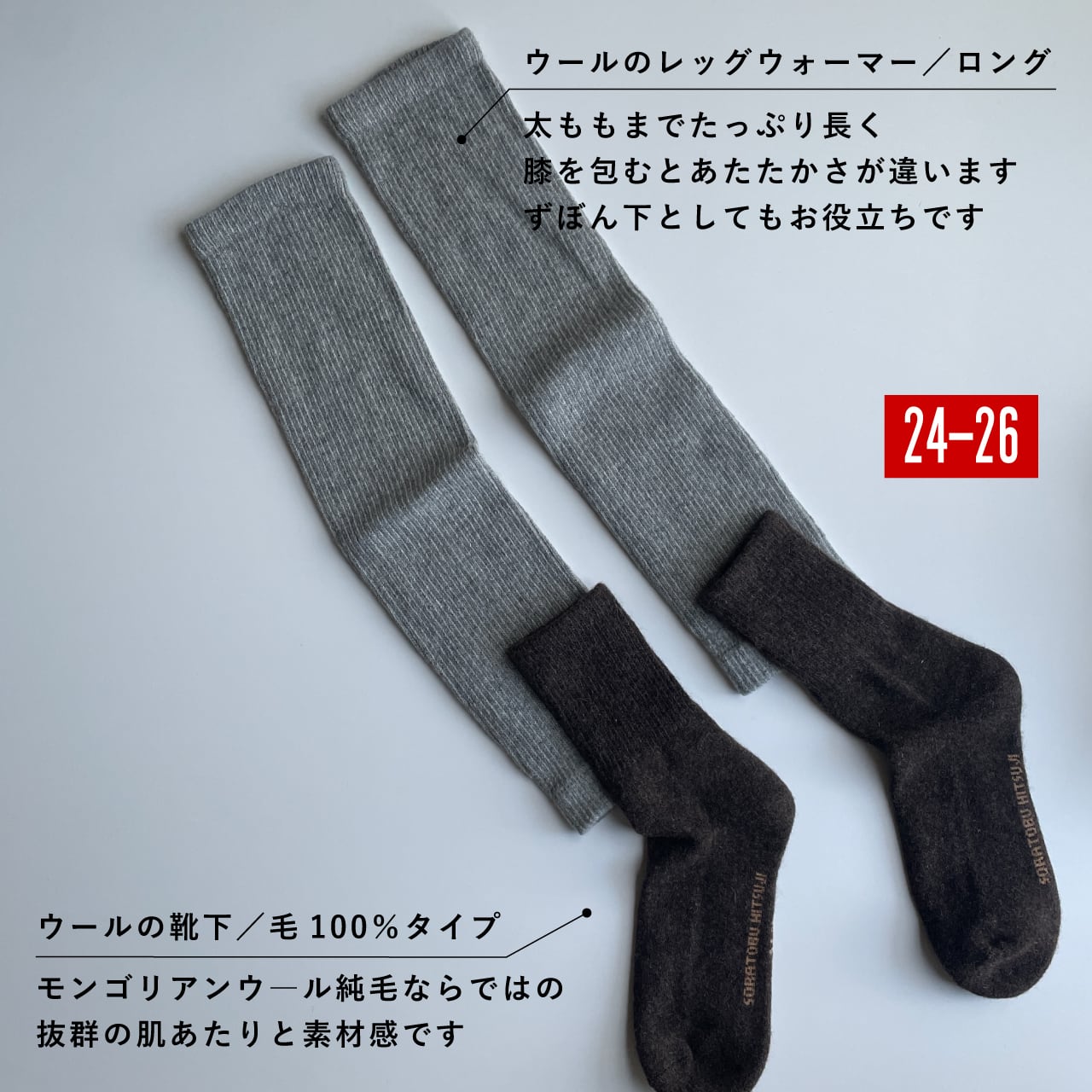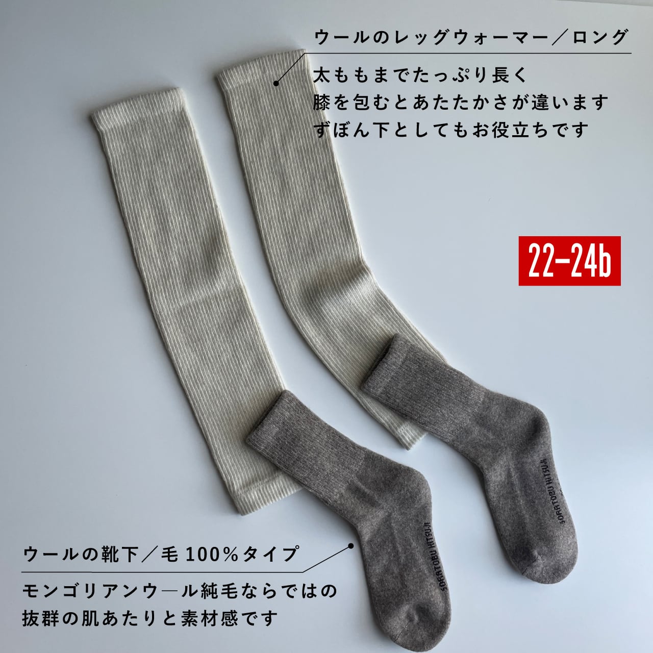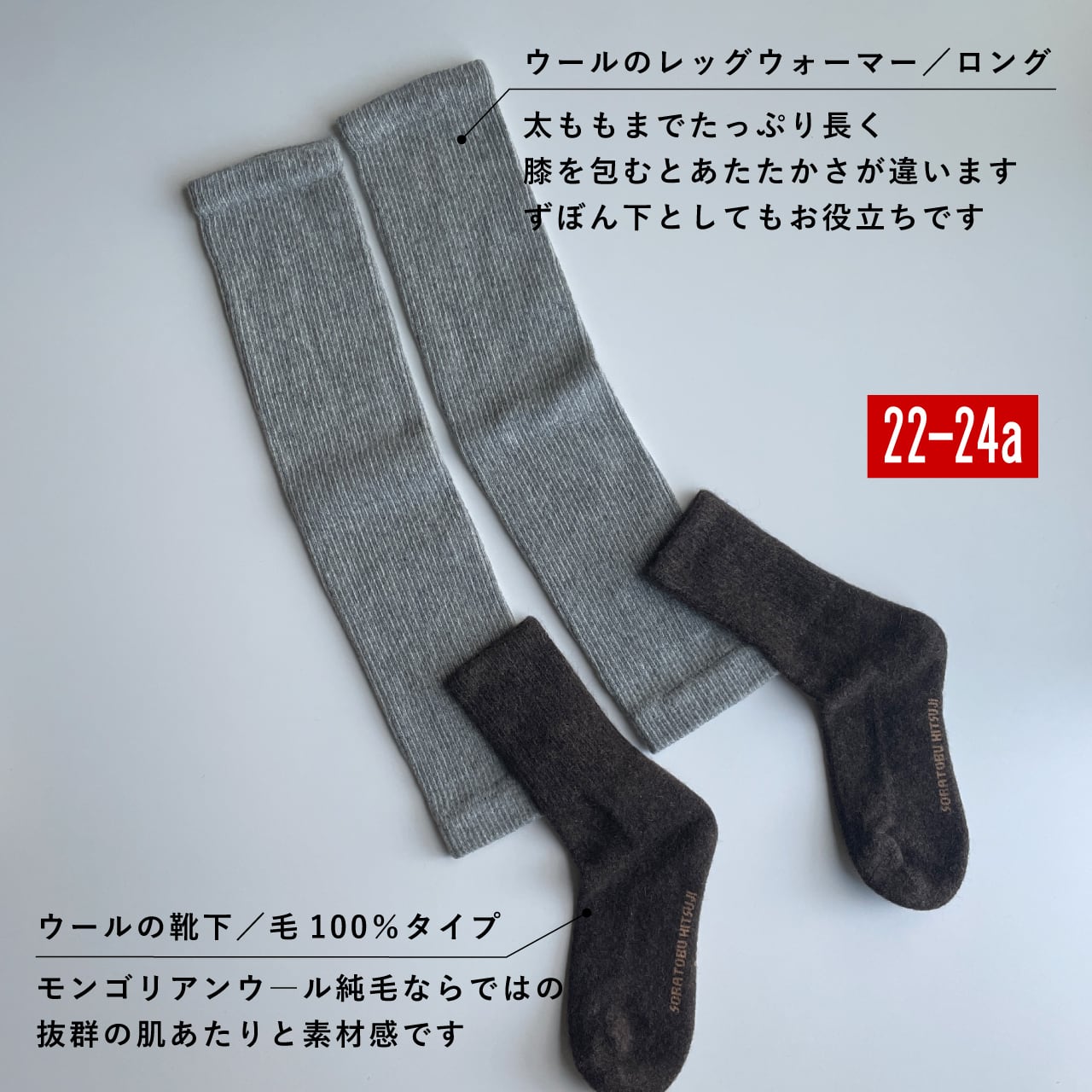 「空飛ぶ羊」の基本のき、モンゴリアンウールの靴下とヒザから太ももまで覆うロング丈のレッグウォーマー。寒い季節の毎日に役立つ、頼れる2アイテムを組み合わせました。天然毛ならではのあたたかさと、しっかりとした力強さを感じていただけます。