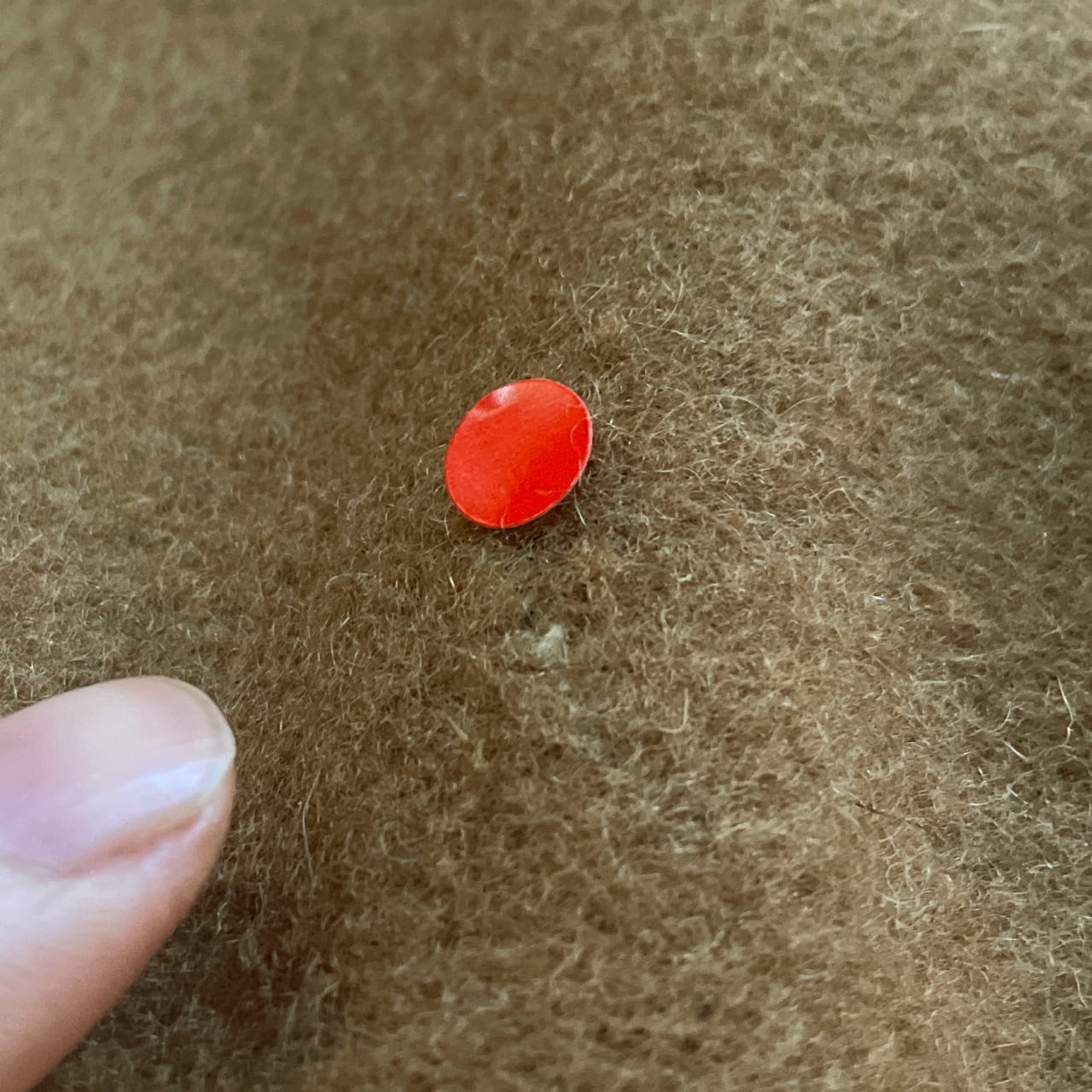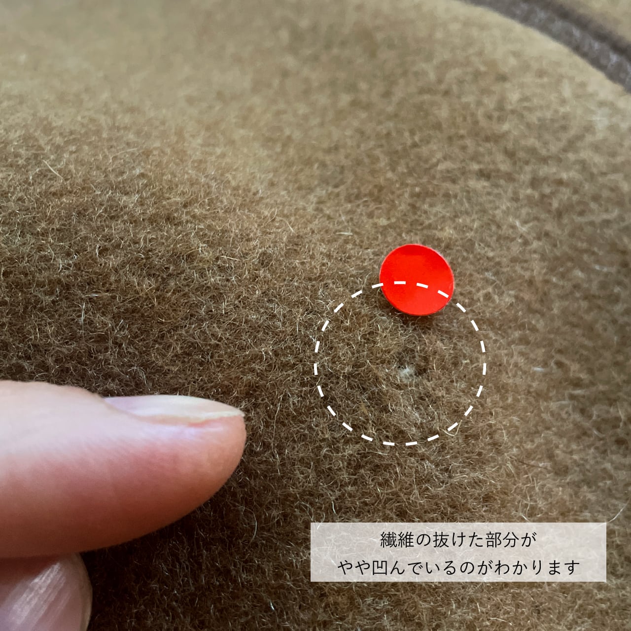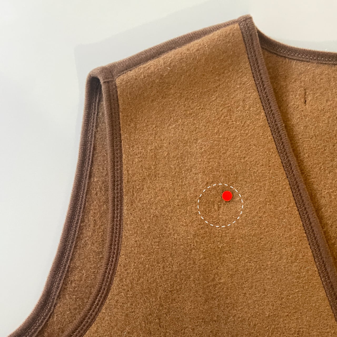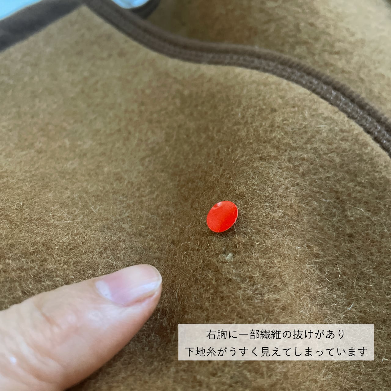 天然素材の特性として、色ムラや小さなキズが見られることは通常品でもご案内していますが、こちらは右胸の目立つ位置に繊維キズがあり、白く穴があいたように見える箇所があります。