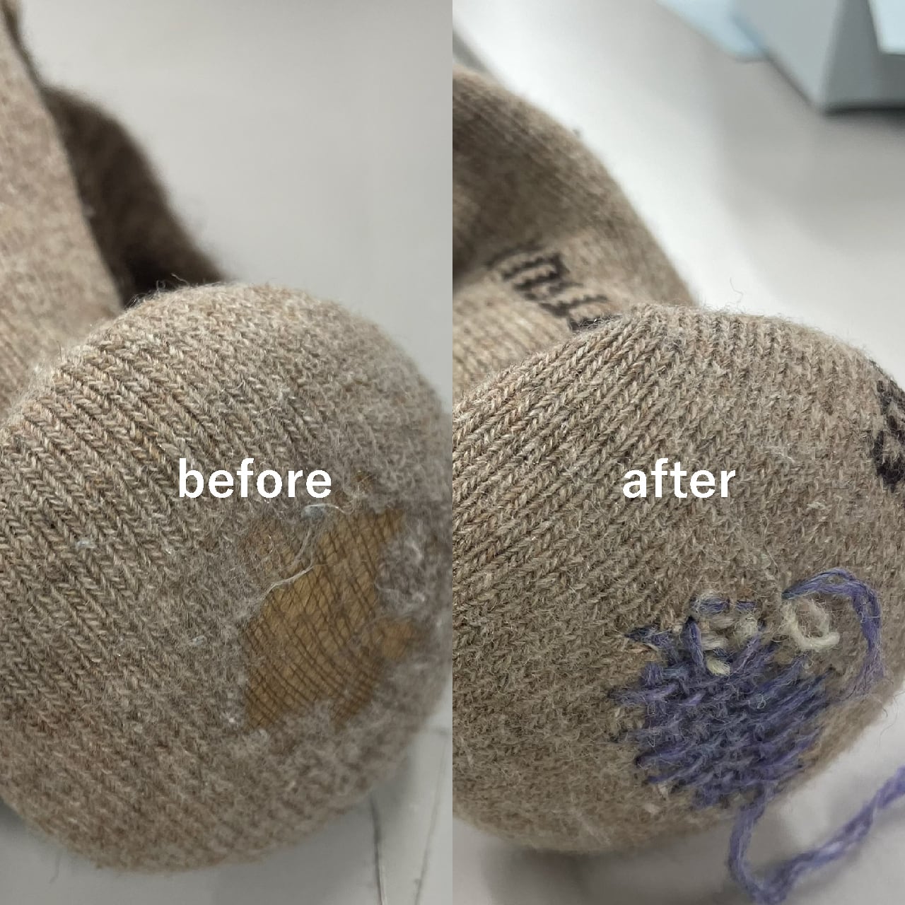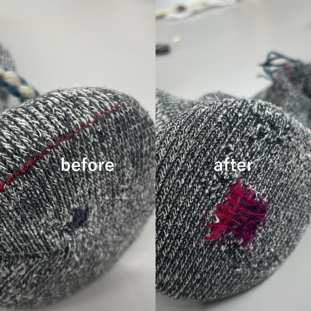 繕った後、お洗濯をして油分を落とすことで、糸が本来の柔らかさを取り戻し、ふっくらと膨らみます。周囲の生地と馴染み、手作業ならではの自然で優しい表情が生まれます。