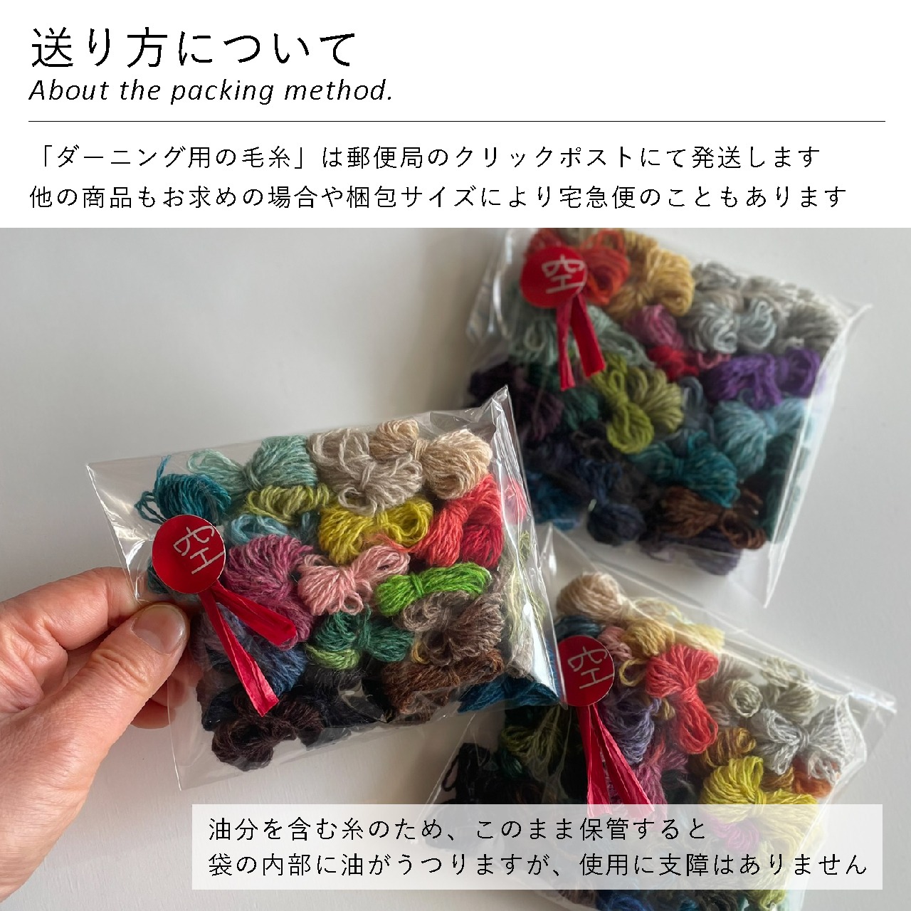 セーターの穴あきや靴下の補修など、ダーニングでは色選びも楽しみのひとつ。15gの中に、およそ20色のニュアンスカラーを詰め込みました。同系色で馴染ませたり、あえて差し色でアクセントをつけたり。あなただけの色彩で大切なニットを彩ってください。