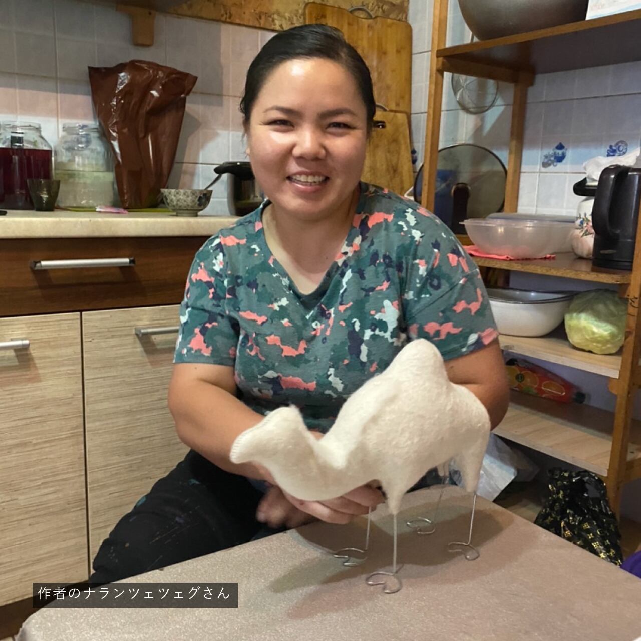 「空飛ぶ羊」代表アリューンダリの故郷ウランバートル近郊にお住まいでご縁がつながりました。現在も育児と制作を両立しながら、元気に制作を続けています。
