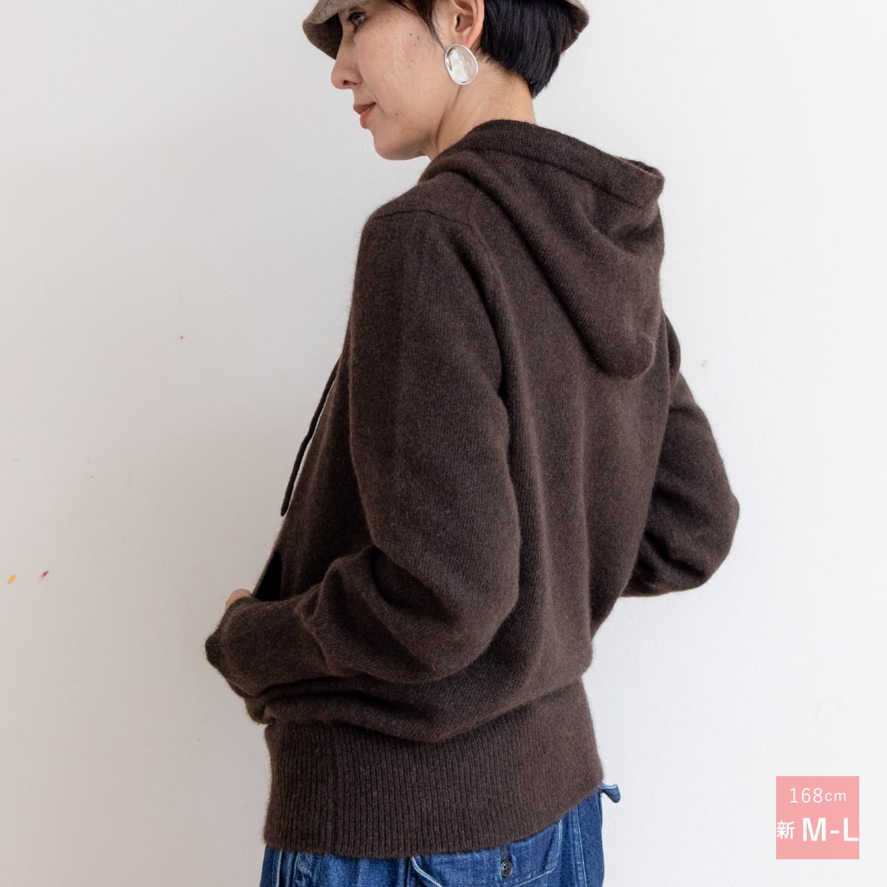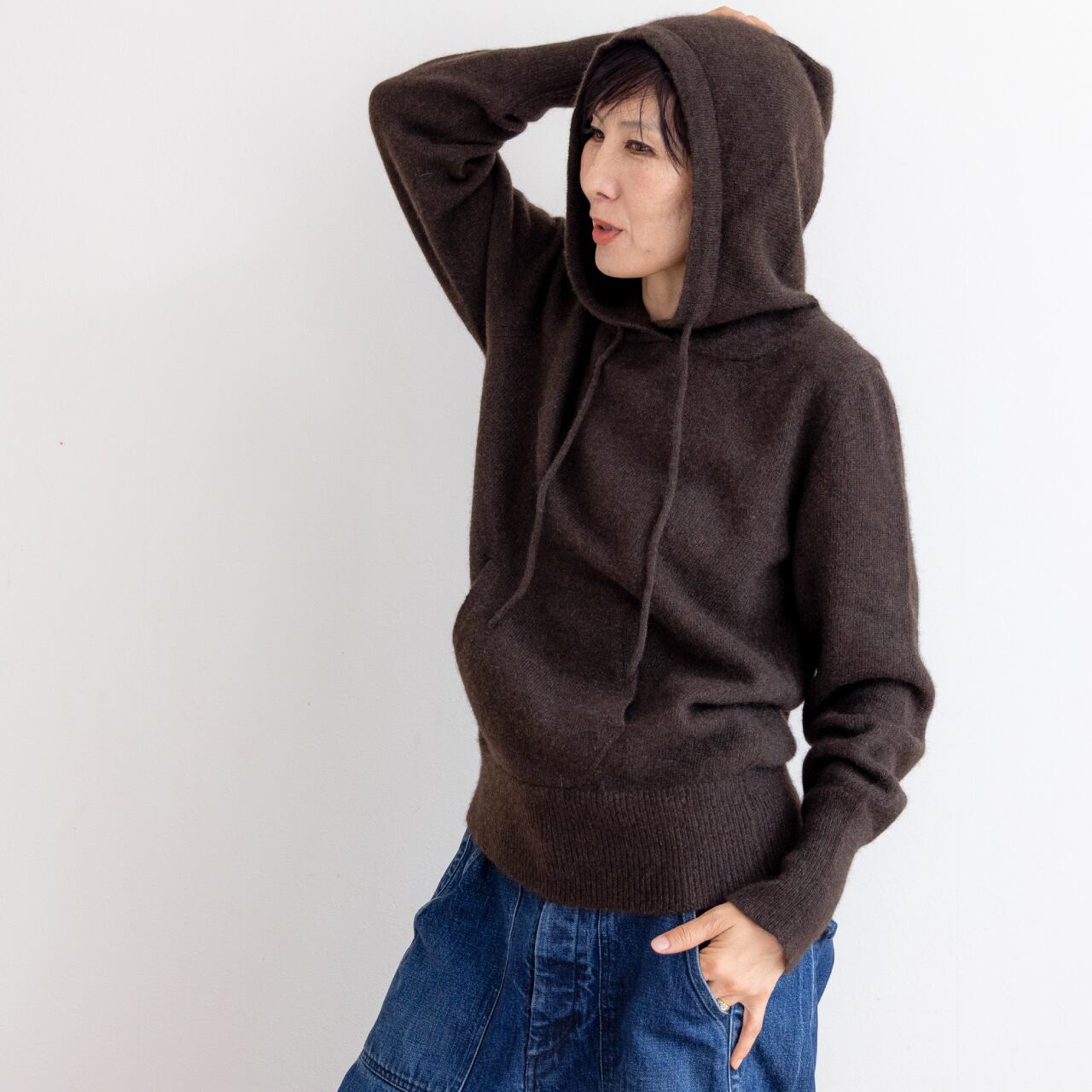 ちょっと斜行した前ポケットと長いフード紐がアクセント。落ち着きある無染色の濃いめマロンブラウンは、さまざまな装いに自然に馴染みます。