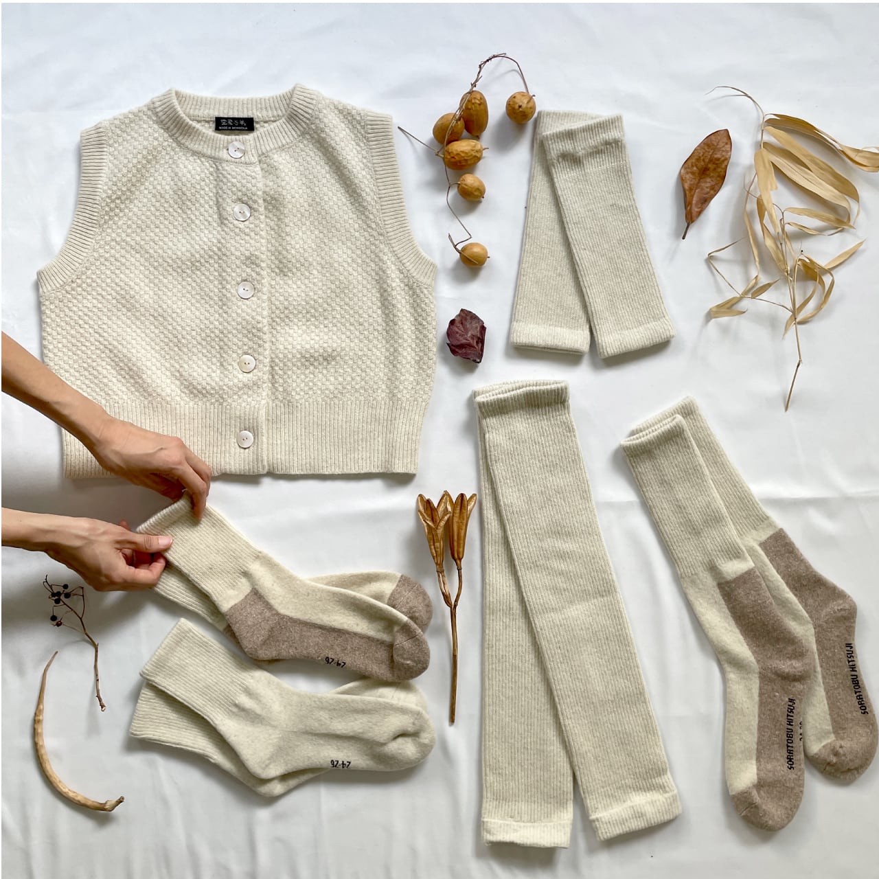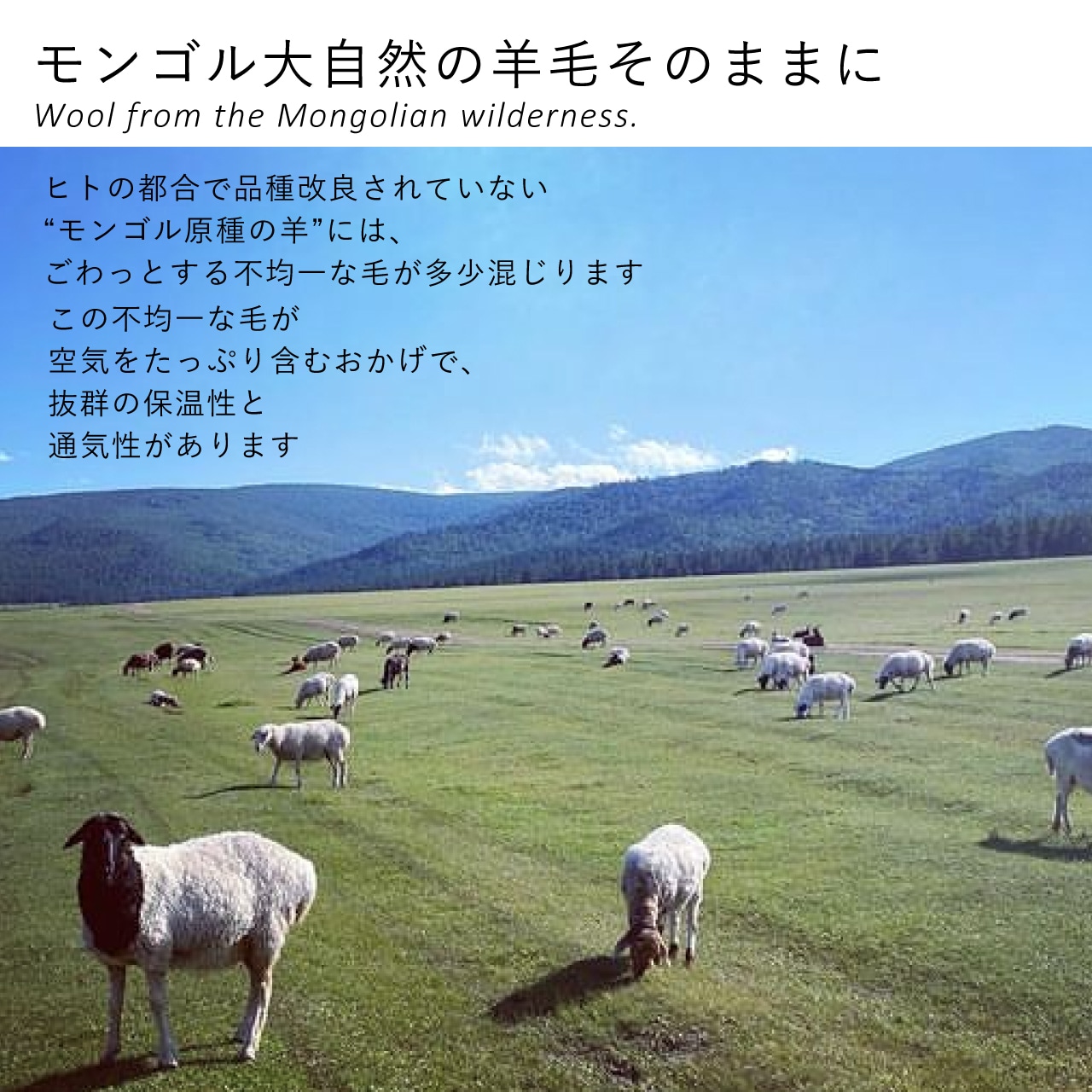 「空飛ぶ羊」のアイテムは、すべてモンゴルの大自然に生きる動物たちの天然毛を使用しているため、採毛時期により色味や風合いがシーズンごとにわずかに異なります。仕上げ加工によるサイズ感にも個体差が生じることがあります。天然素材の特性としてご理解ください。