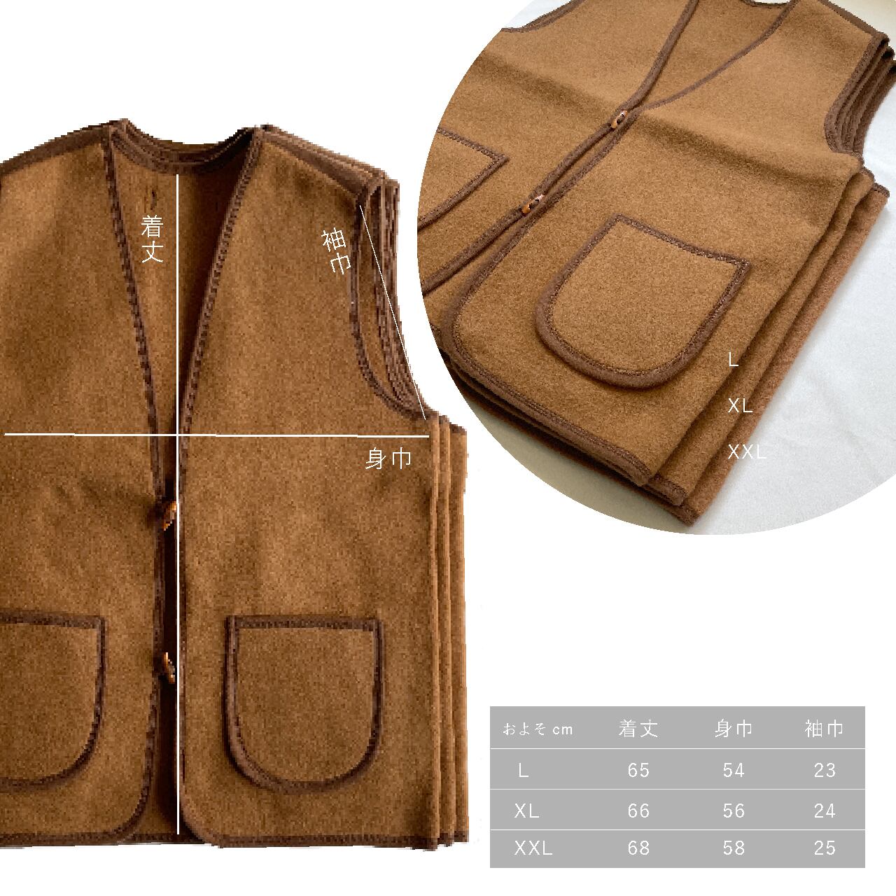 ※ご注意:このベストは現地モンゴルのサイズ規格のため、一般的な日本のサイズイメージより小さめに感じられる傾向があります。重ね着羽織り用には少し大きめをおすすめします。