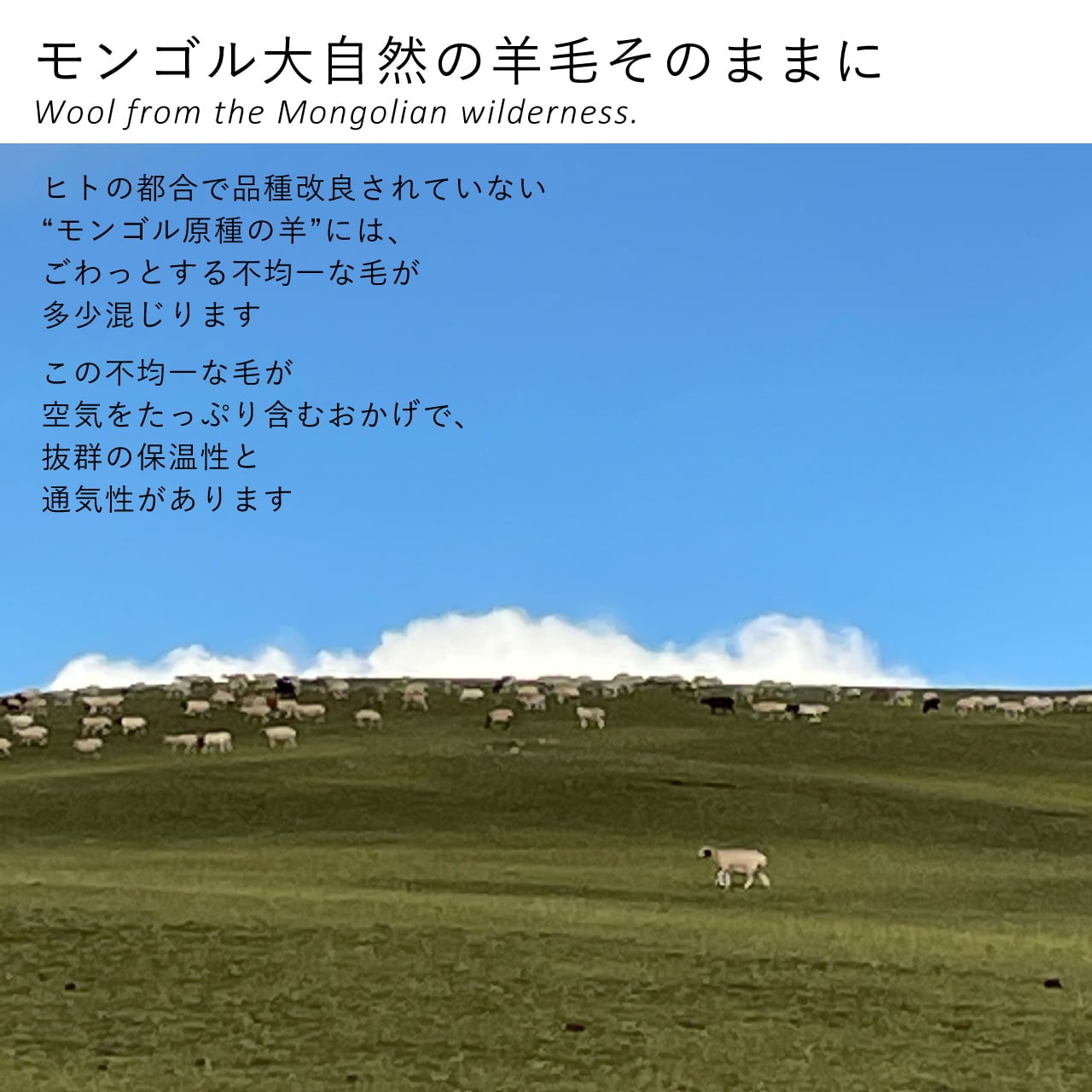 「空飛ぶ羊」のアイテムは、すべてモンゴルの大自然で育った動物たちの天然毛を使用しています。採毛時期や仕上げ加工により、色味や風合い、サイズ感に個体差が生じる場合があります。