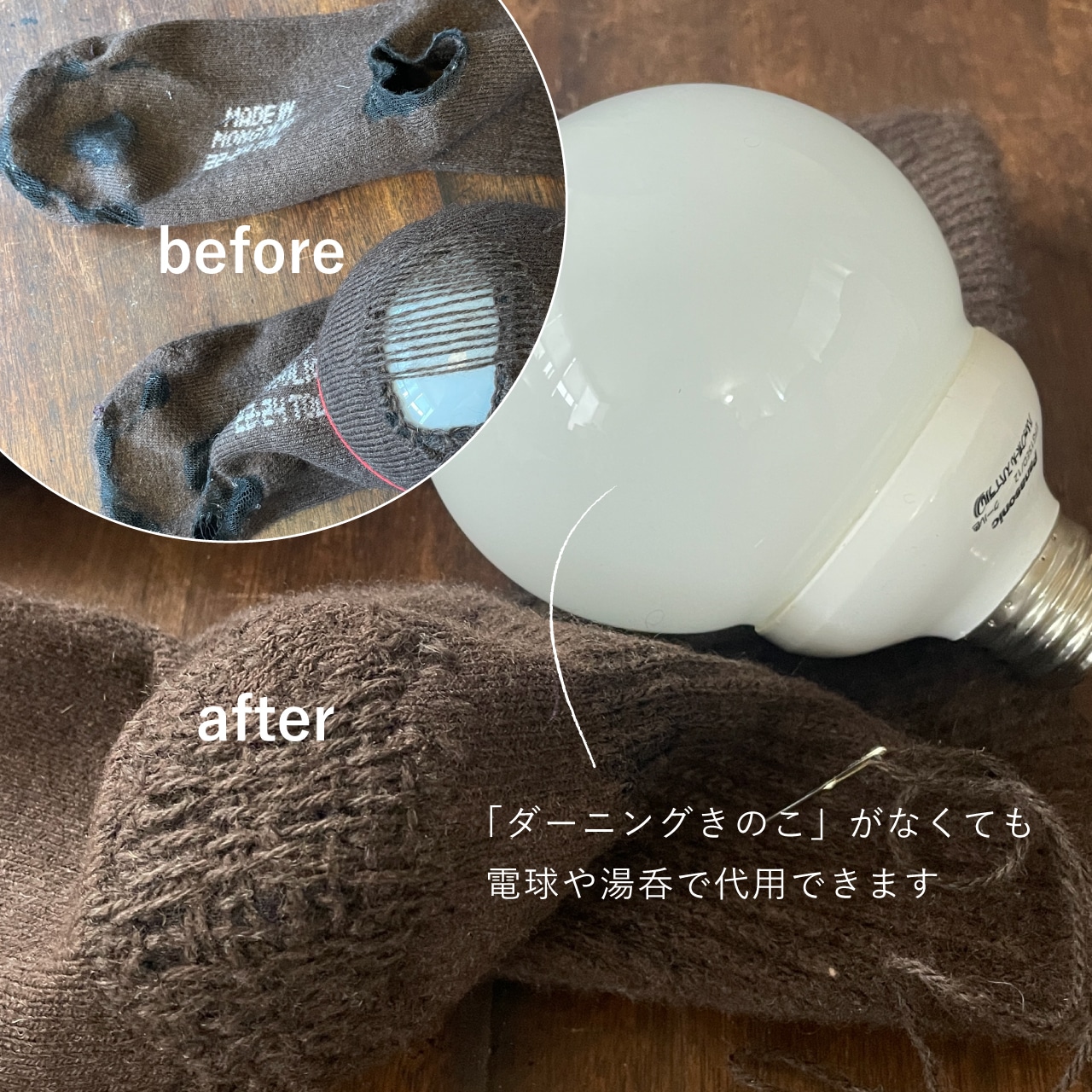 「ダーニング(Darning)」とは、穴や擦り切れた箇所を自分で繕う手仕事のこと。専用の道具がなくてもOK。電球や湯呑で代用できます。