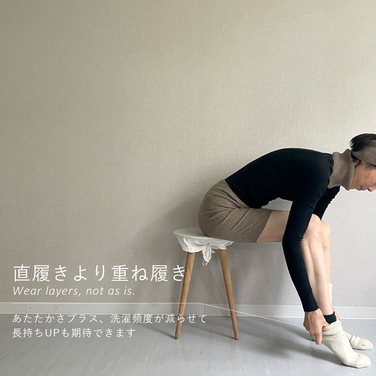 着用や洗濯を重ねると摩擦などで薄くなることがありますが、その際はダーニングなどで繕いながら、末永くご愛用ください。