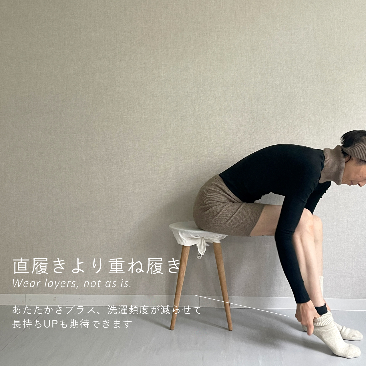 着用や洗濯を重ねるうちに擦れて穴があくことがあります。その際はダーニングなどで繕って、長くご愛用いただけると幸いです。