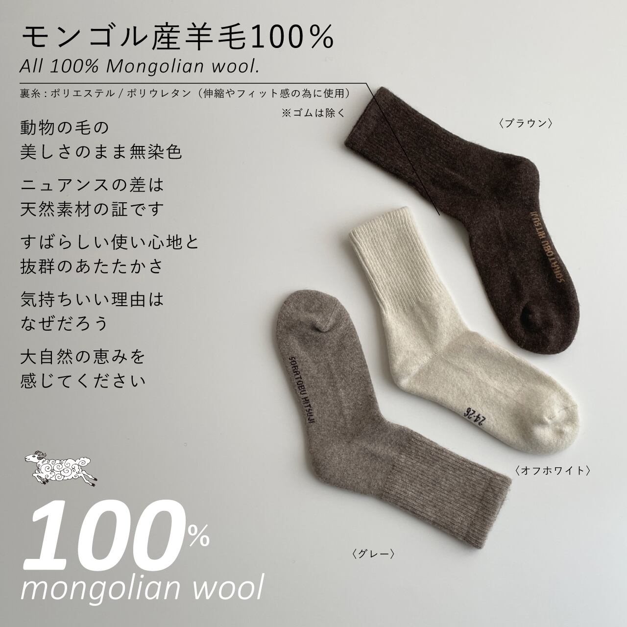 「空飛ぶ羊」のアイテムは、モンゴルの大自然で育った動物たちの天然毛を使用しています。採毛時期や仕上げ加工により、色味・風合い・サイズ感に個体差が生じることがあります。これは天然素材ならではの特性です。