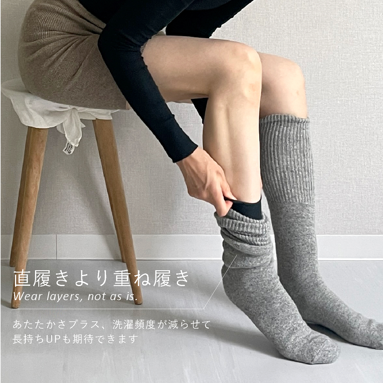 着用や洗濯を重ねると摩擦などで薄くなることがありますが、その際はダーニングなどで繕いながら、末永くご愛用ください。