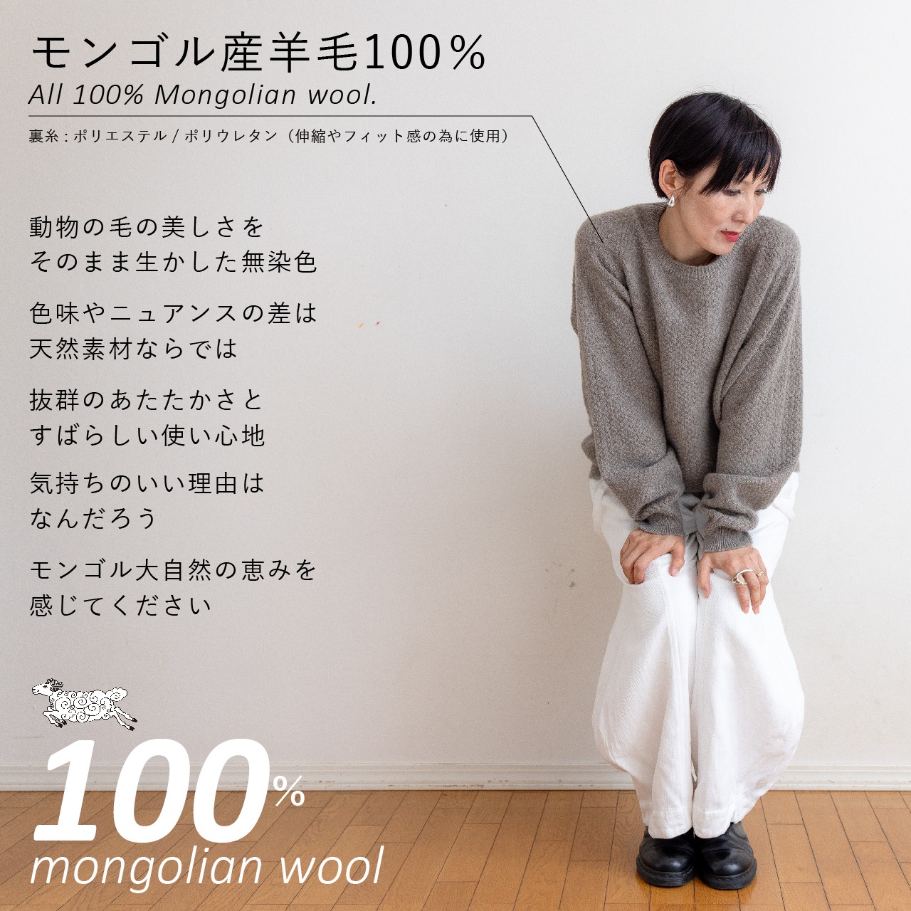 「空飛ぶ羊」のアイテムは、モンゴルの大自然に生きる動物たちの天然毛を使用しています。採毛時期や仕上げ加工により、色味・風合い・サイズ感に個体差が生じることがあります。これは天然素材ならではの特性です。