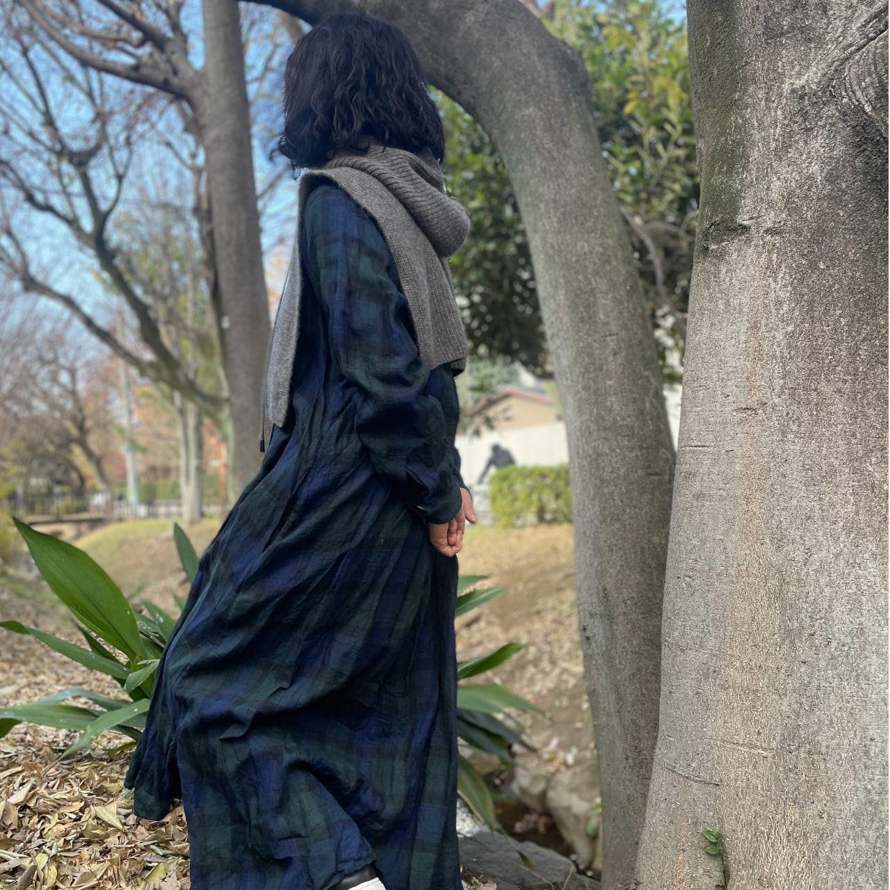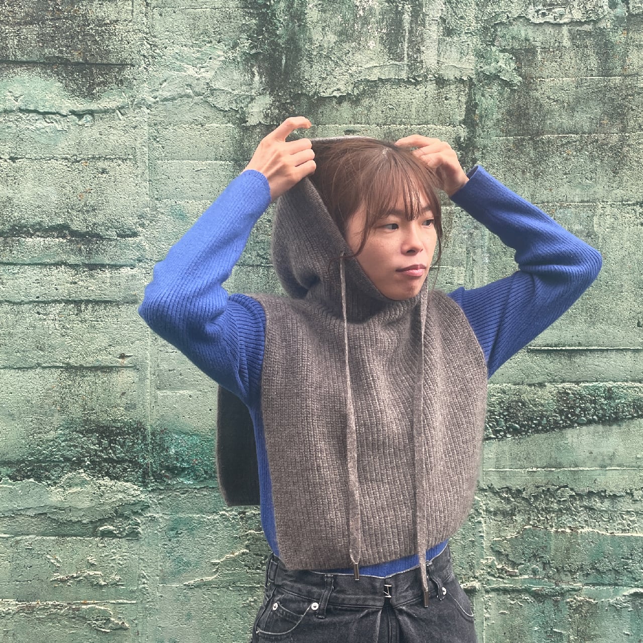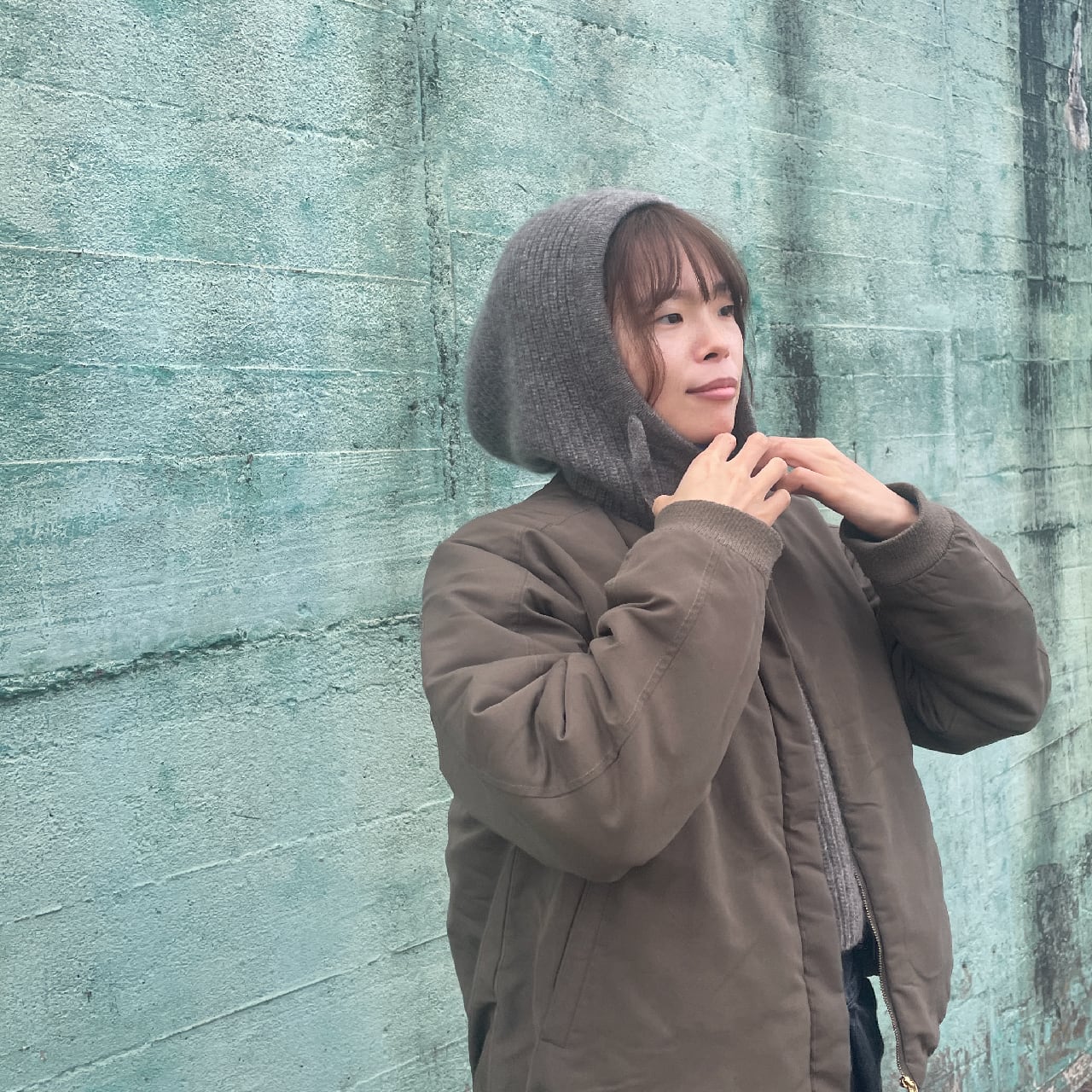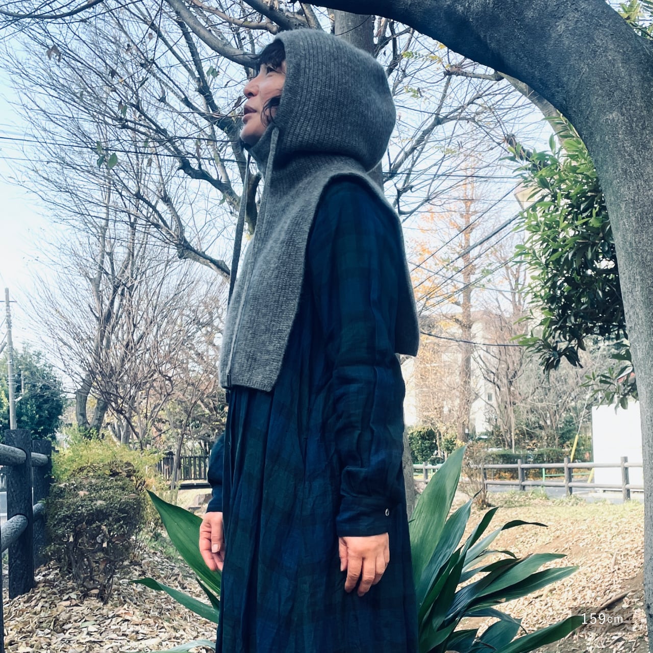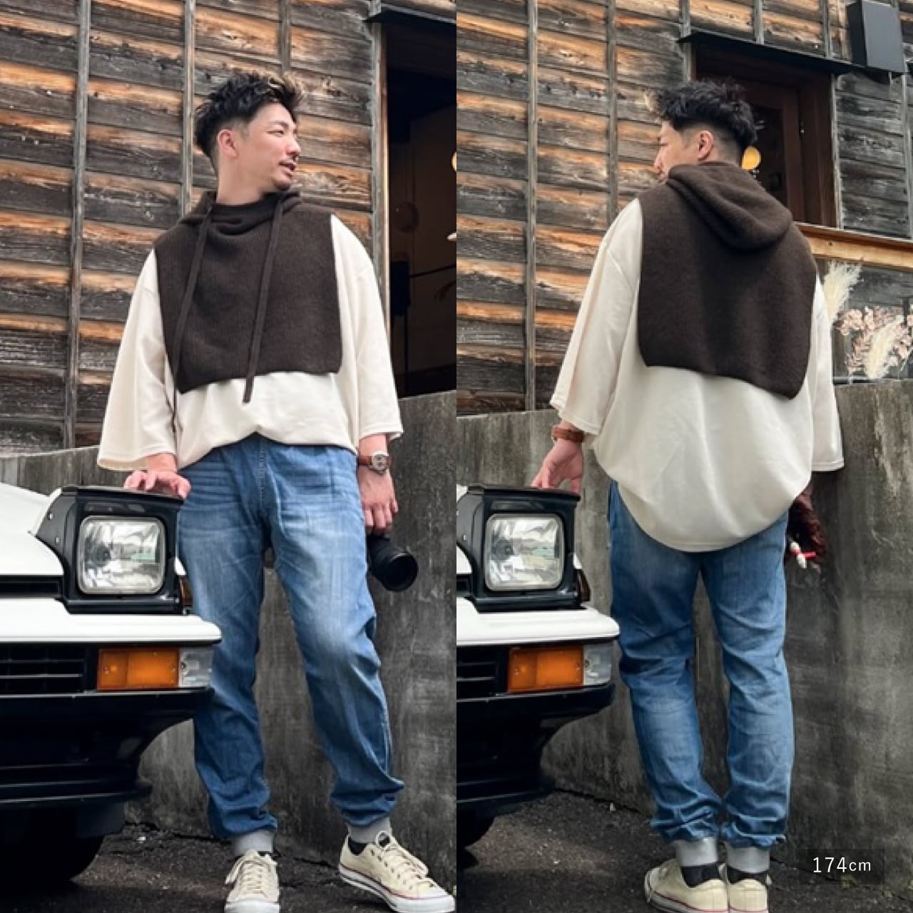 アウターとしても使いやすいフード付き。首元から肩~背中までをやわらかくやさしく包み込みます。温暖化の昨今ならこの肩掛けプラスαで長いシーズン乗り越えられそうな安心感です。