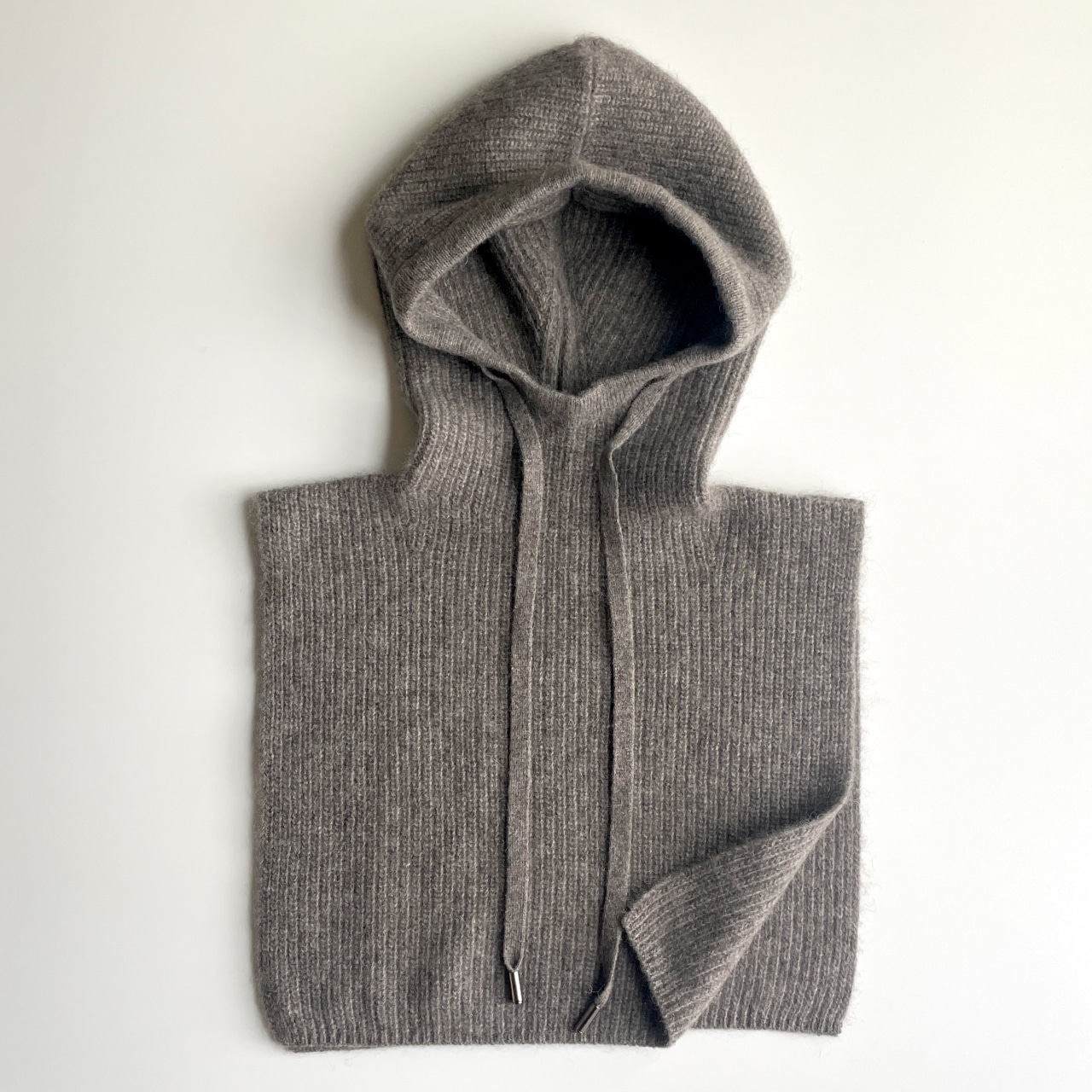 無染色のモンゴル産ヤク毛を贅沢に100%使用。空気をたっぷり含む軽やかなローゲージ編み立てで、ふんわりあたたかなフード付き肩掛けが届きました。